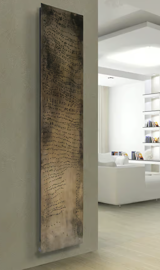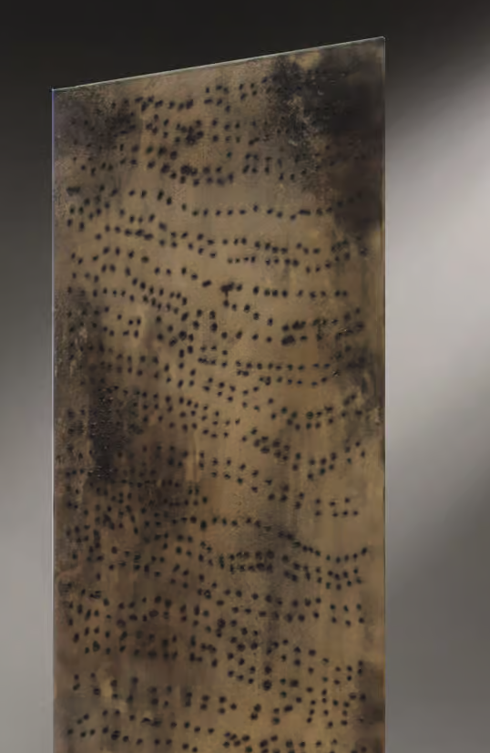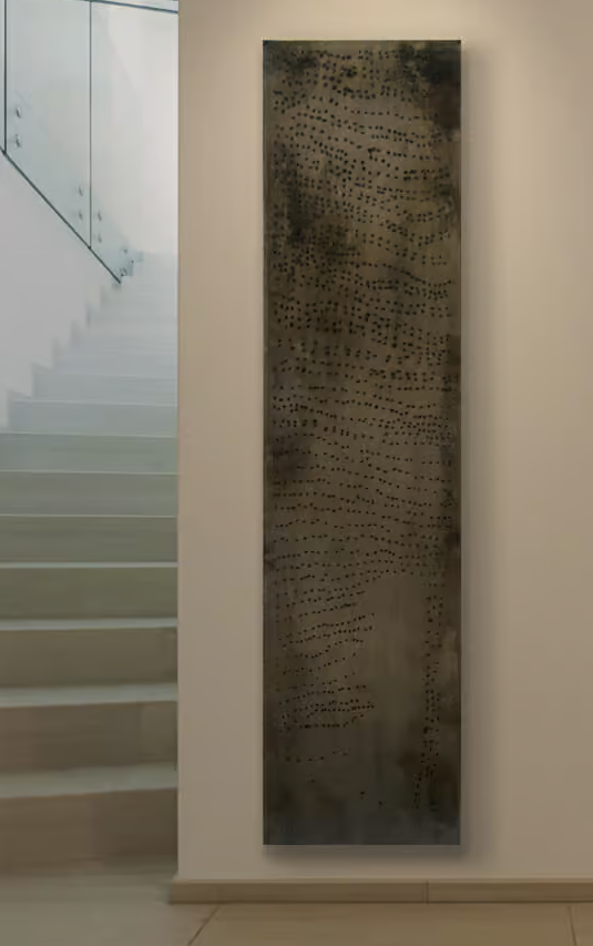 Steven Cavagna has rudely played around with the material, using the Plasma cutting technique to manually drill a steel plate. The result is a series of irregularities in the metal created by these holes and the burn marks, giving it its significant and unmistakable character.