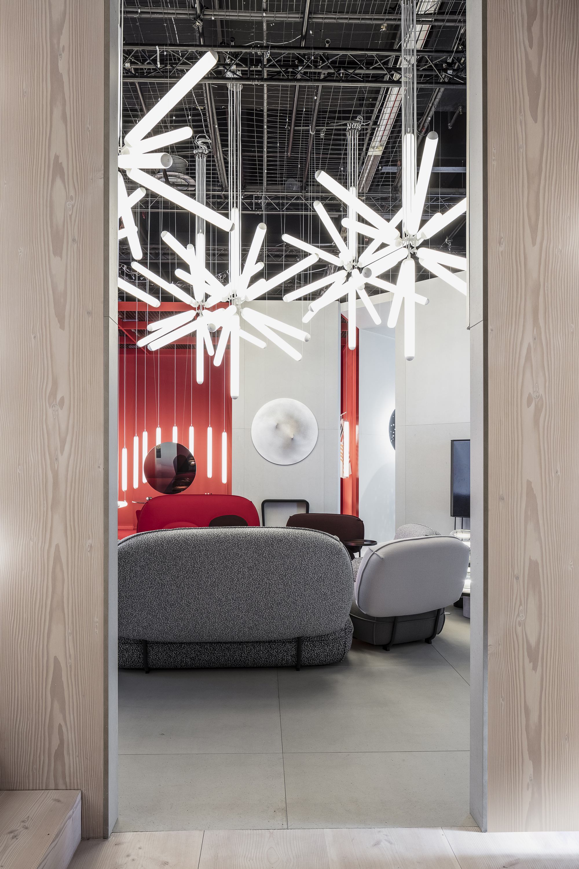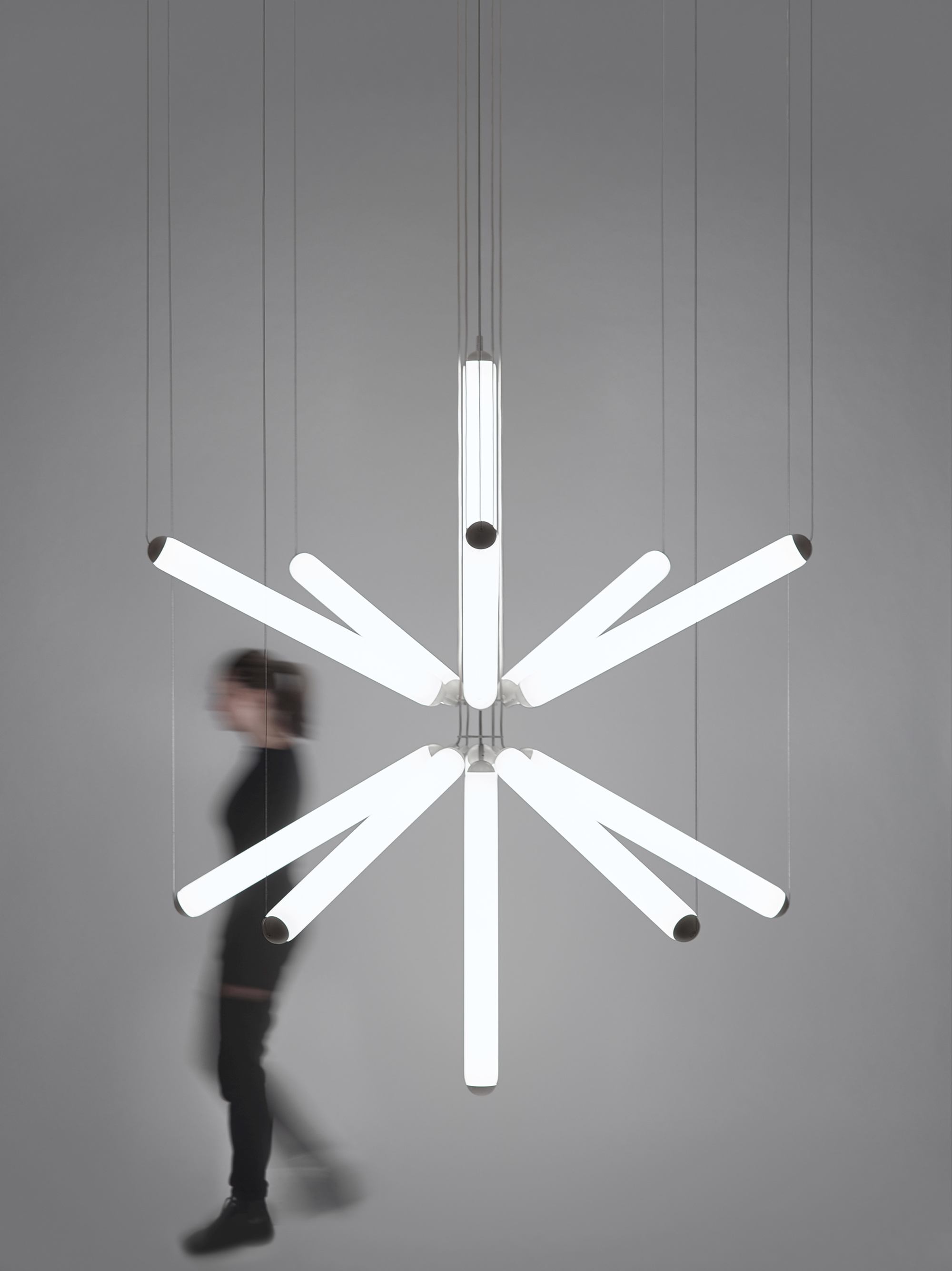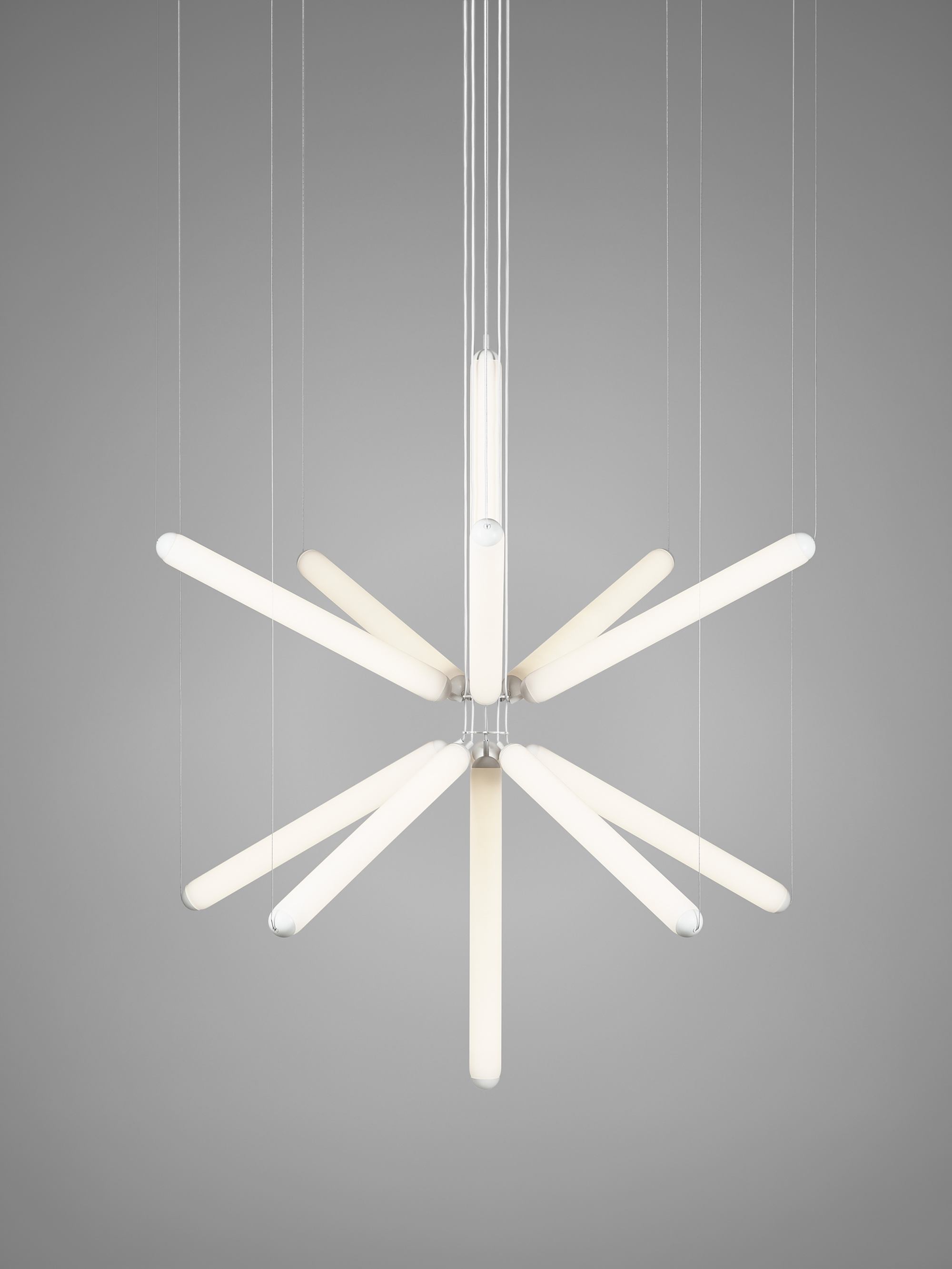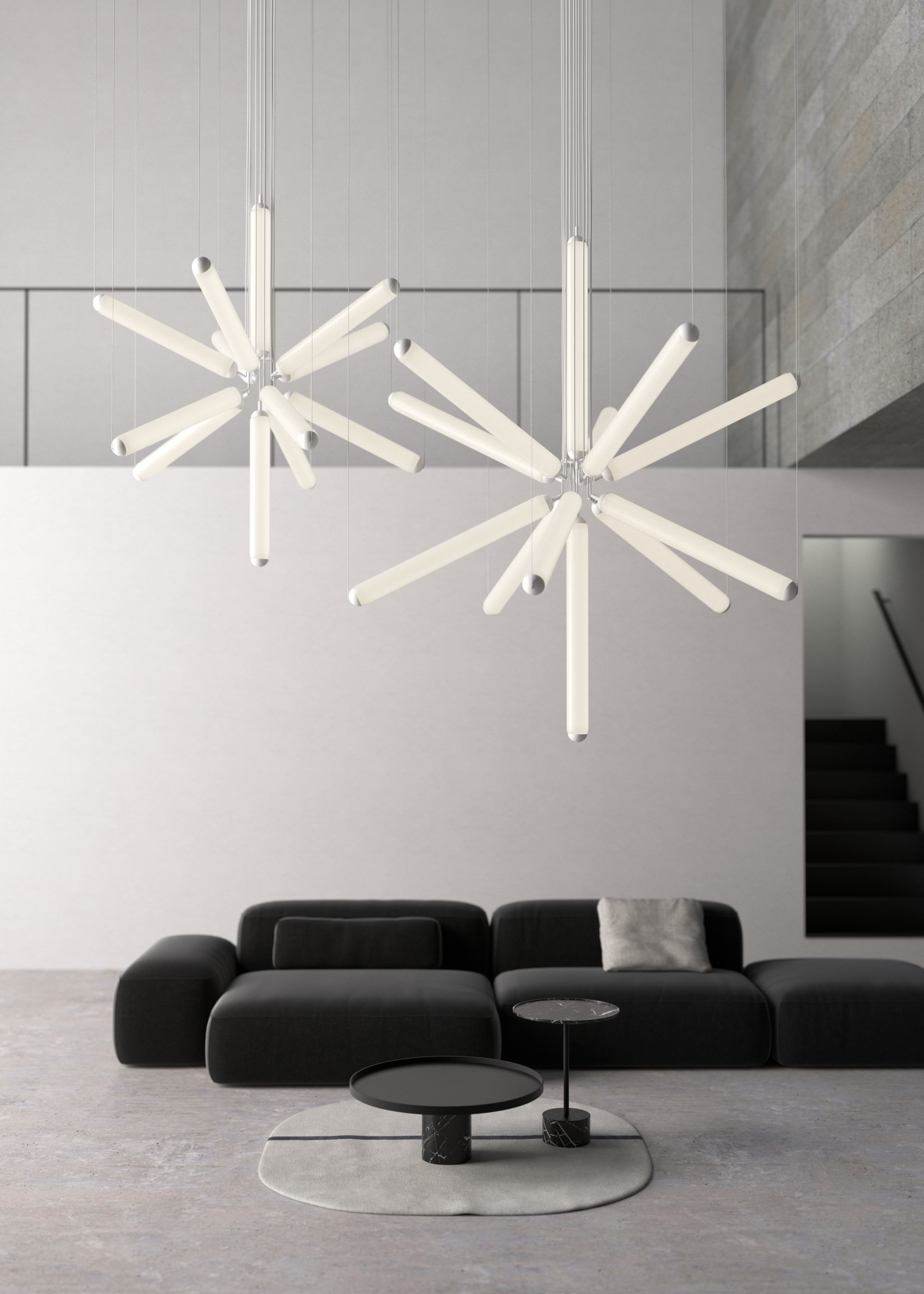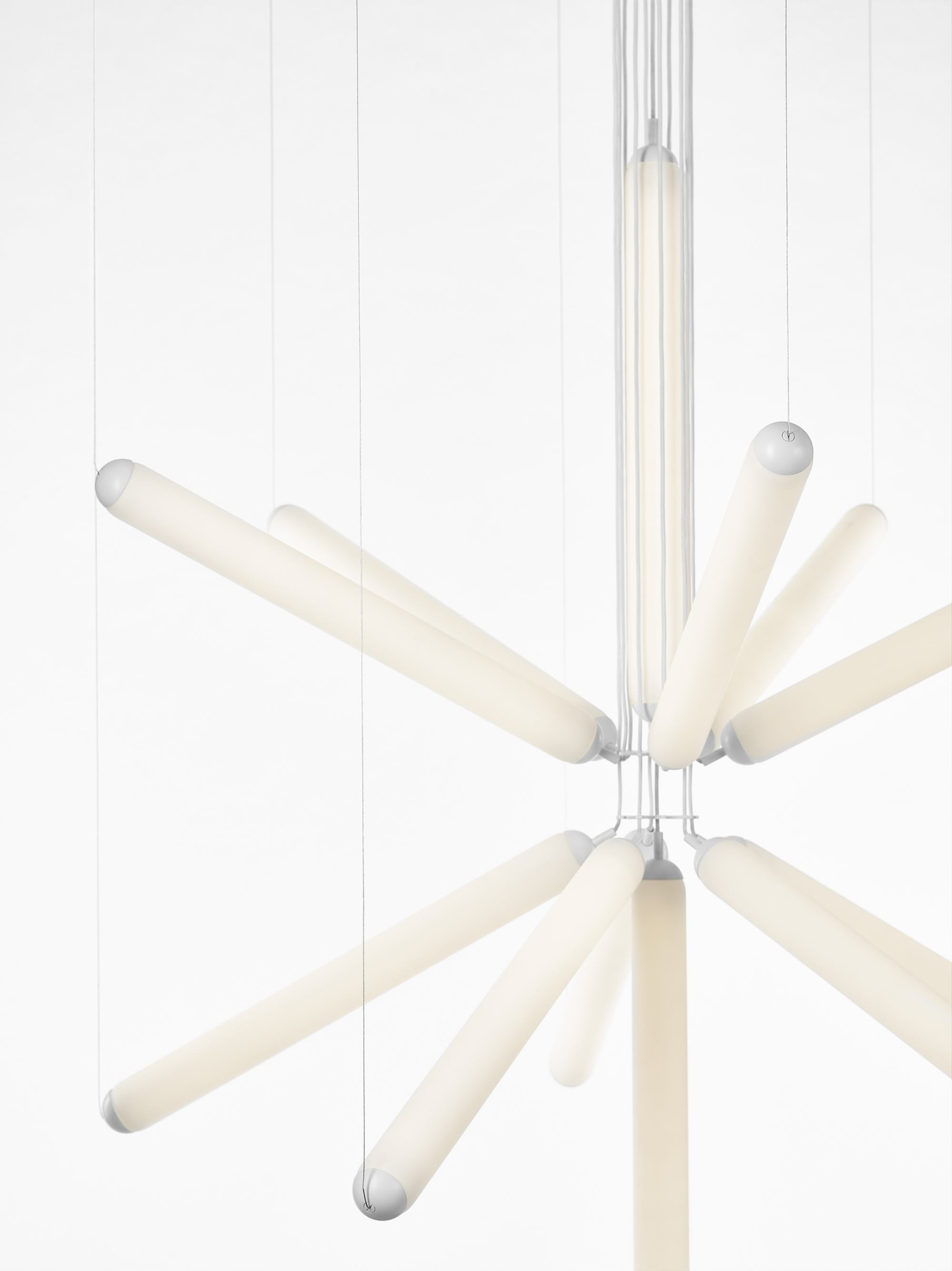 The endless variability of the Puro collection has given rise to several new lighting objects, such as the suspension light called Sparkle. The symbolic Sparkle shines with noble yet minimalistic geometry and constitutes the centrepiece of any space. The multiple tubes of matte opal or smoke grey glass radiate outward in diffuse light for a magical interior ambience and dynamic. Sparkle levitates in space and dominates its interior landscape. It is a light sculpture and the embodiment of positive energy.