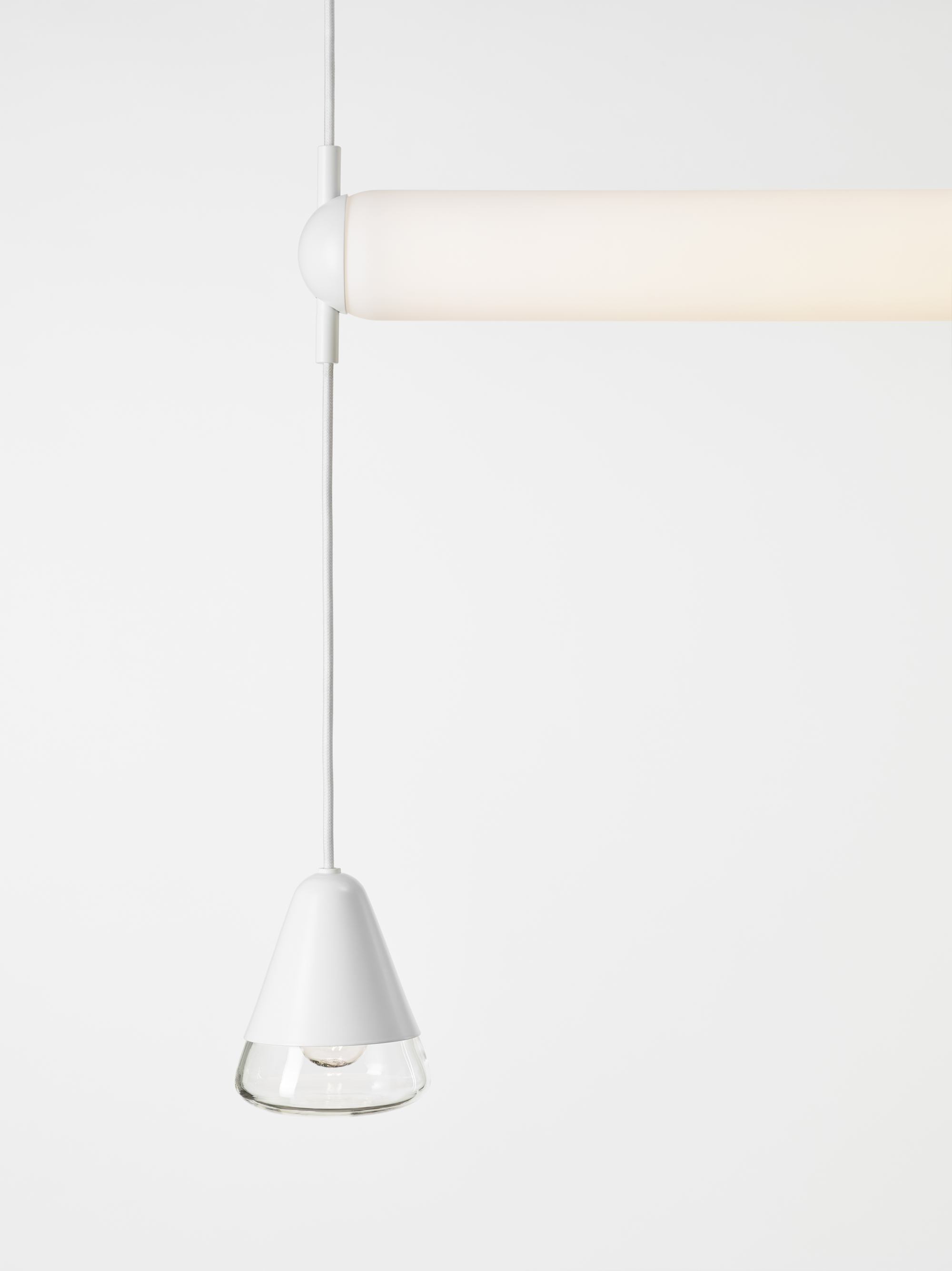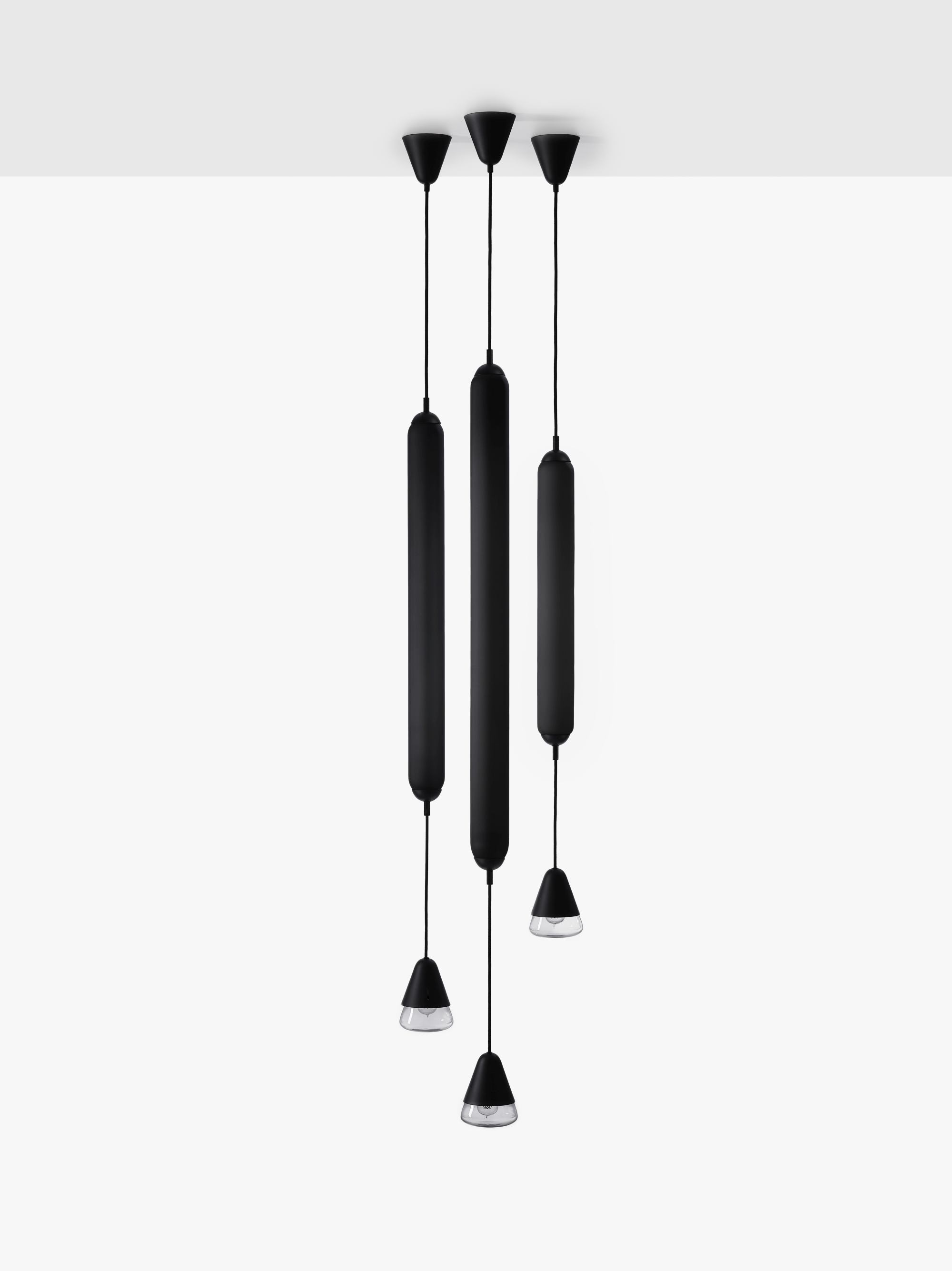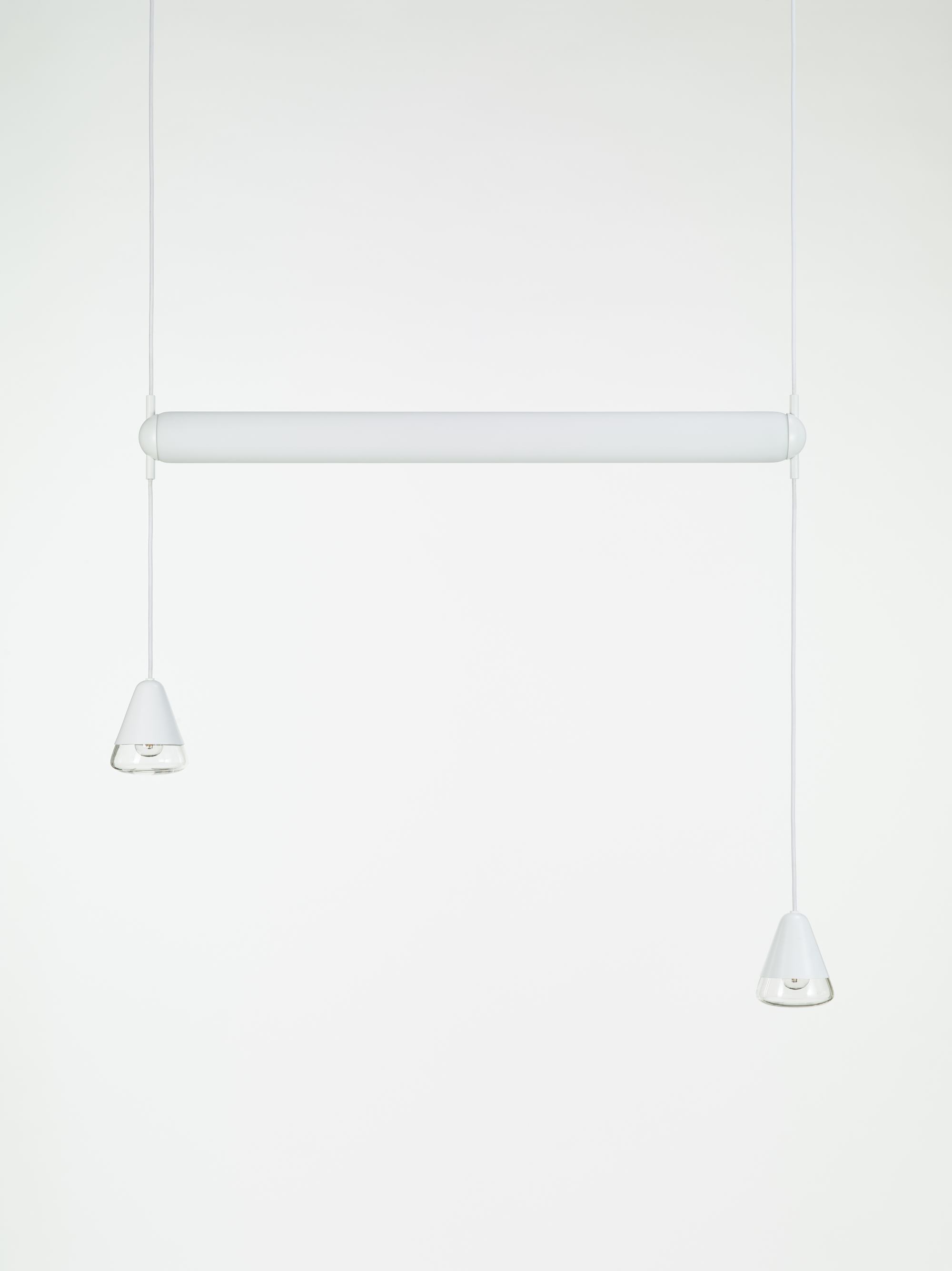 Puro is a boldly minimalistic variation on atmospheric pendant lights. Inspiration for the collection and its name come from the Spanish word for “cigar”, which also means “puro” and is a reference to the composition’s clean lines. The design creates an intriguing interplay between horizontal and vertical luminous cigar tubes levitating in space above simple bell lights. The diffused glow of the tubes combines with that of the bells to elicit a dynamic ambience, while the alternating gloss and matte finishes provide a degree of provocation.