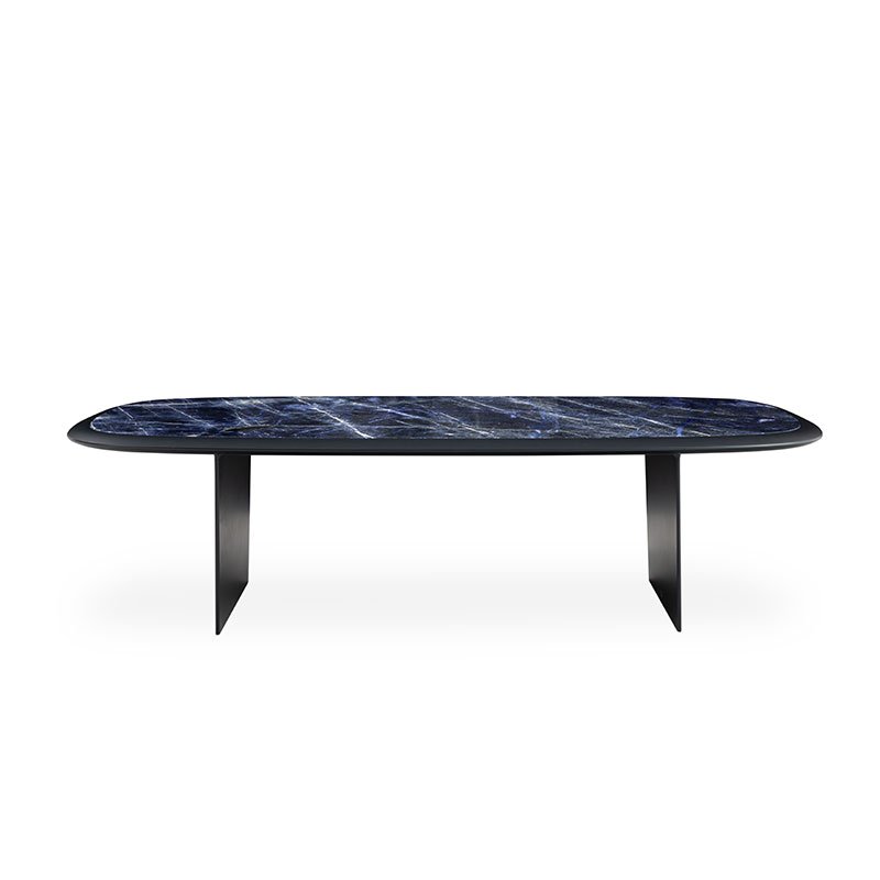 Impressive and spectacular. The Florio table is dedicated to Bugatti’s legendary victories in the Targa Florio, one of the oldest sports car racing events in the world. Top with shaped edge in Steel Blue or Titanium Silver. Olympic Striato marble or Sodalite, built-in top.