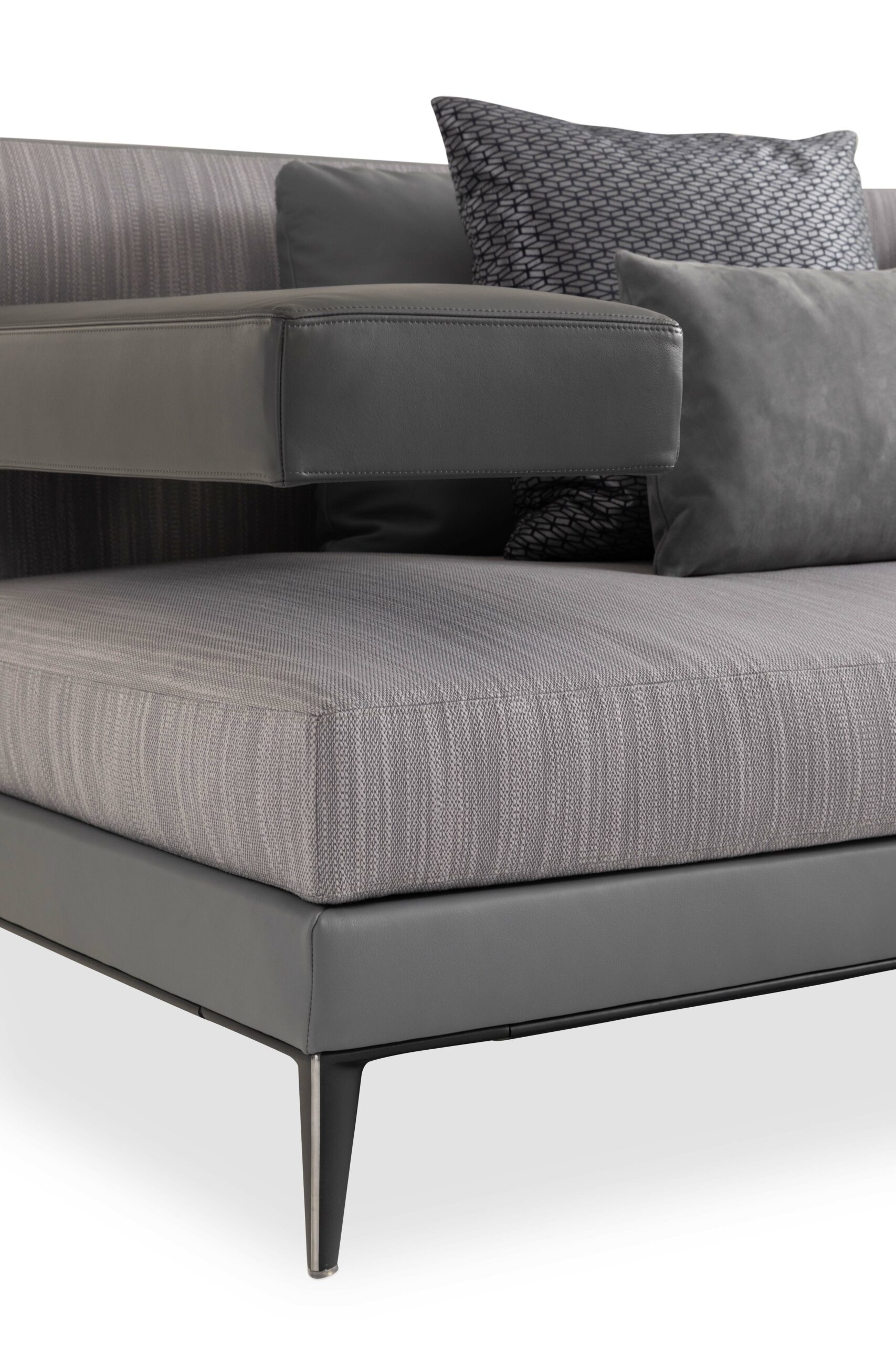 The dorsal fin of the iconic Voiture Noire provided the inspiration for the foot of the modular Flow sofa, which features an aluminium base in Steel Blue or Titanium Silver colour. The armrest defies the force of gravity, highlighting its Bugatti reminiscences, resulting in an exquisitely designed, dynamic product.