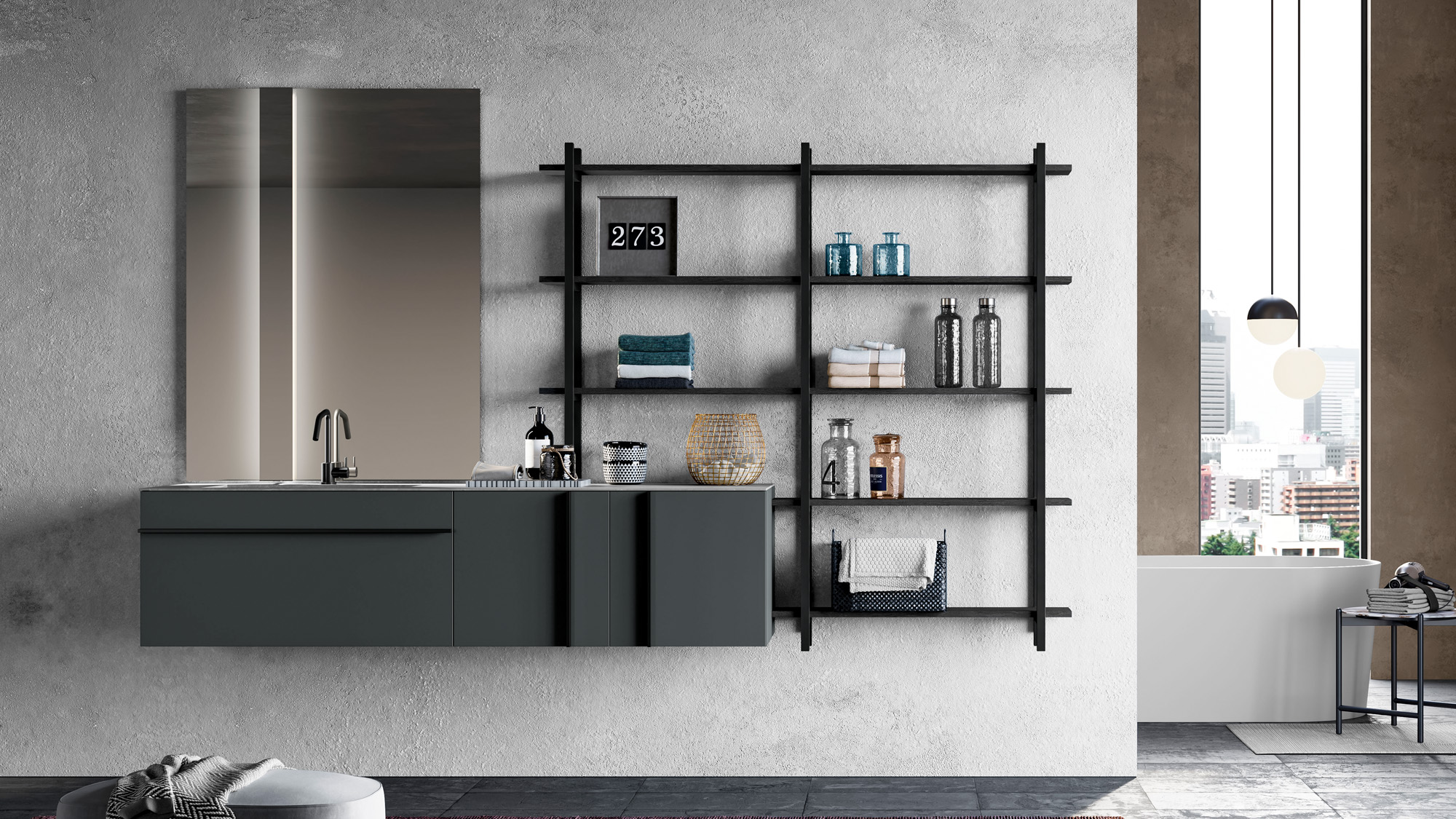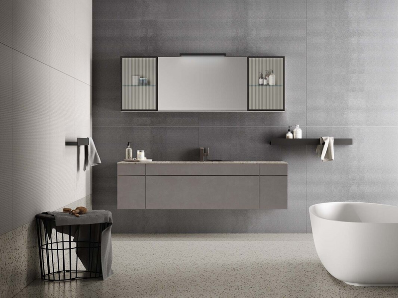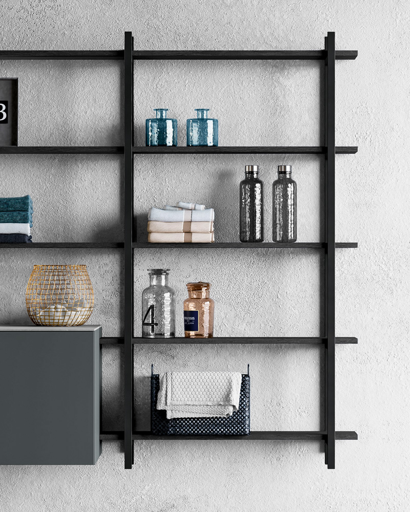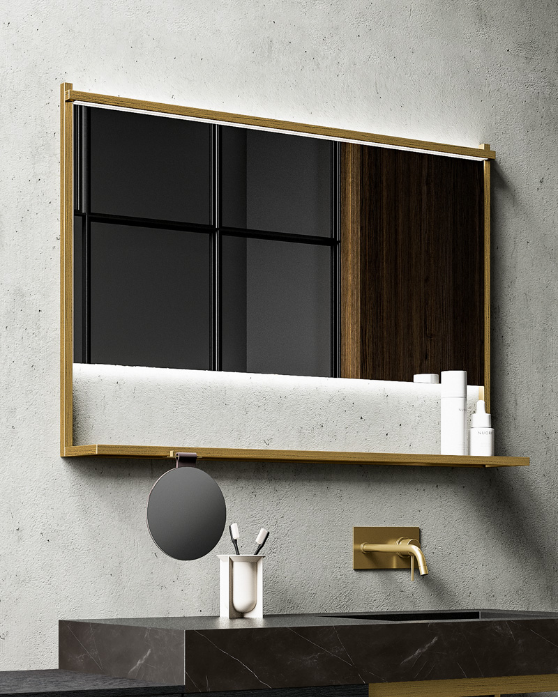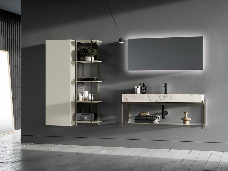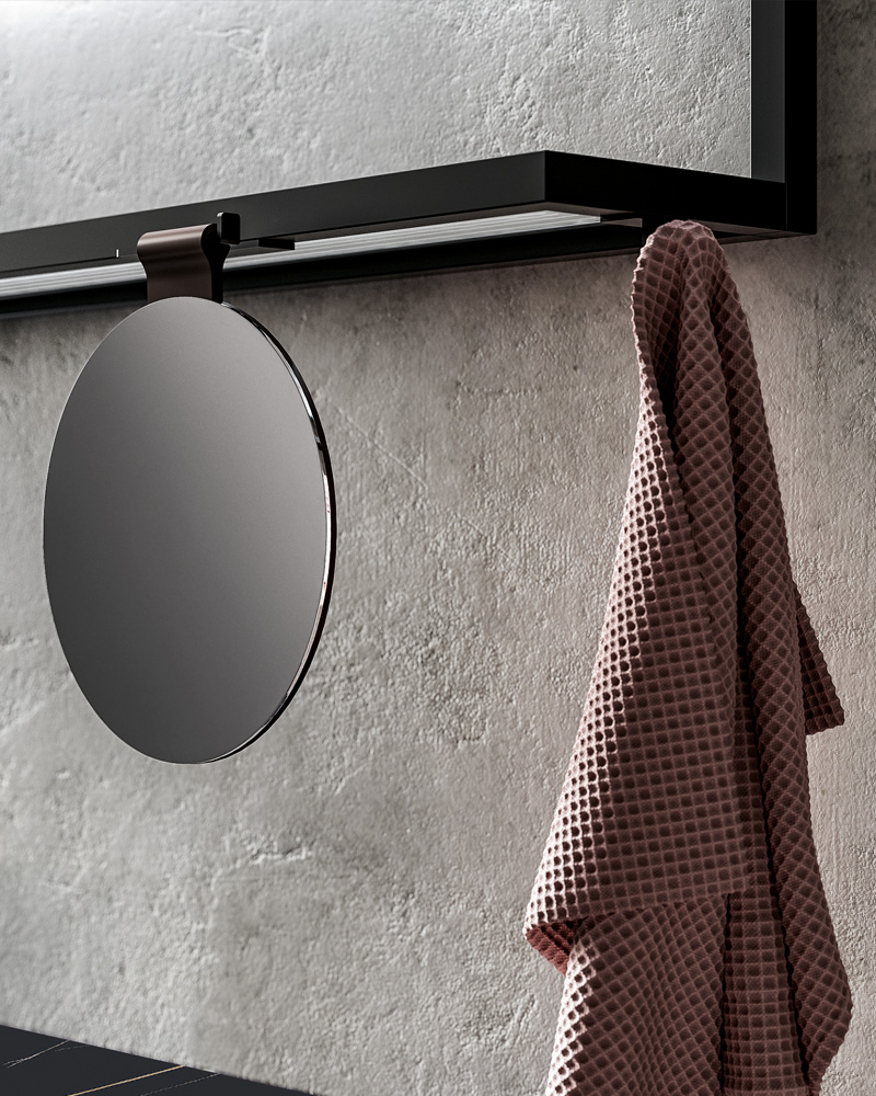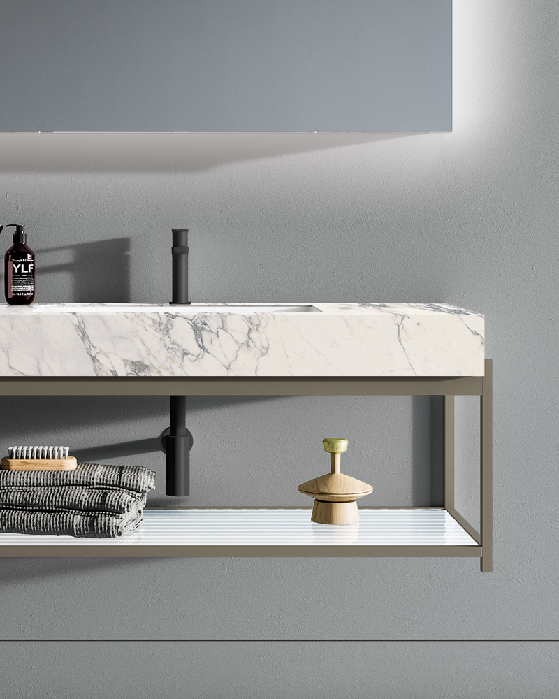 A bathroom furniture with metal elements, born from a simple aluminium tube that can be transformed into an entire bathroom collection, then thinned out into an essential, slender furniture handle, vertical or horizontal.