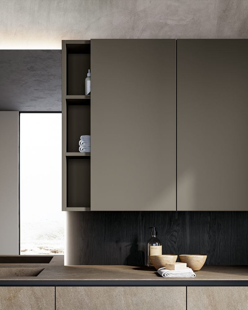 Birex modern bathroom furniture with a strong visual impact. Organisation and rationality are guaranteed by the one-piece element, which stands as the true protagonist of the entire collection. A combination of aesthetics and functionality that plays with modularity and volumes.