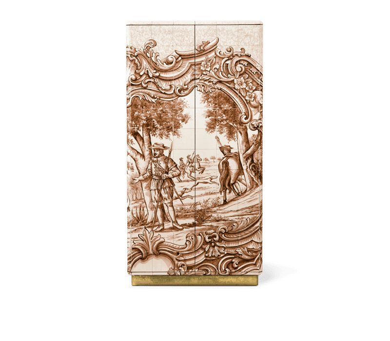 The Heritage Cabinet is a magnificent journey through Portuguese legacy. Covered in Azulejos, traditional hand painted tiles and one of the most representative art forms of Portuguese culture, the architectural cabinet portrays different scenes from the country’s Discoveries era. Centuries of history are gathered in a single final white and sepia panel, and each layer is enhanced by vertical mirrors on the lateral surfaces. The hint of wander through the rich legacy continues when two door open to a lined glossy gold leaf interior, and a classical ornament trim reminds the inside of churches and rich buildings. A clear glass shelve can be seen on the two individual divisions of the cabinet. A statement cabinet, the Heritage can take center stage in the most elegant rooms since its back is also fully hand painted. A lengthy tradition of bespoke and exclusivity to make one-of-kind design pieces.