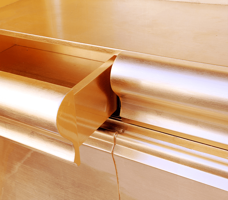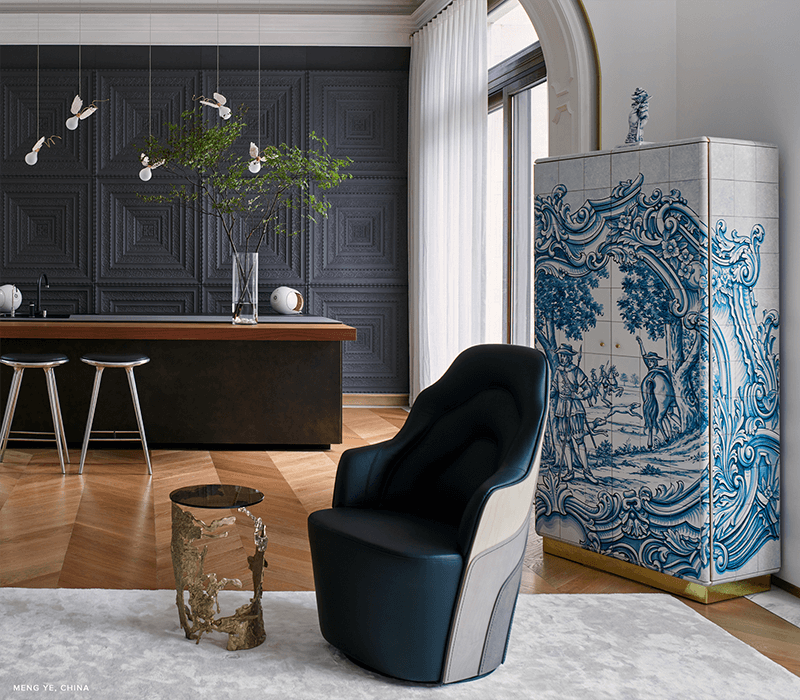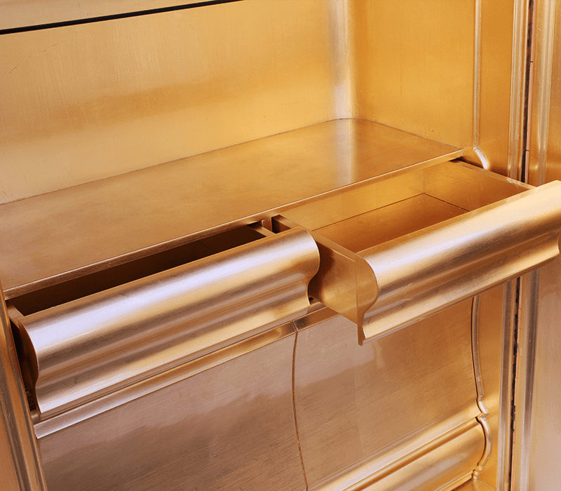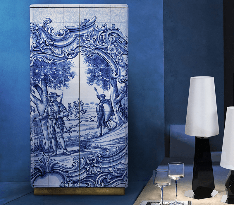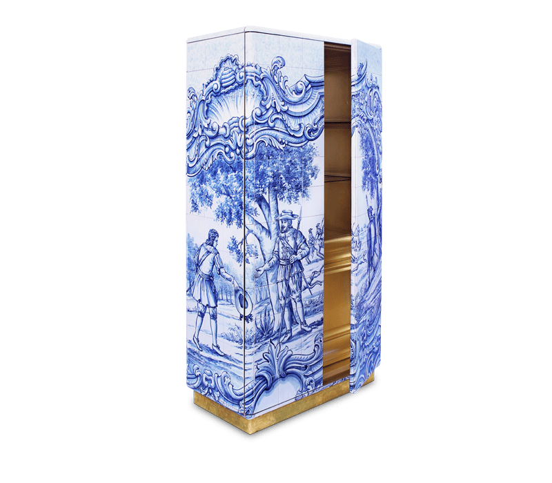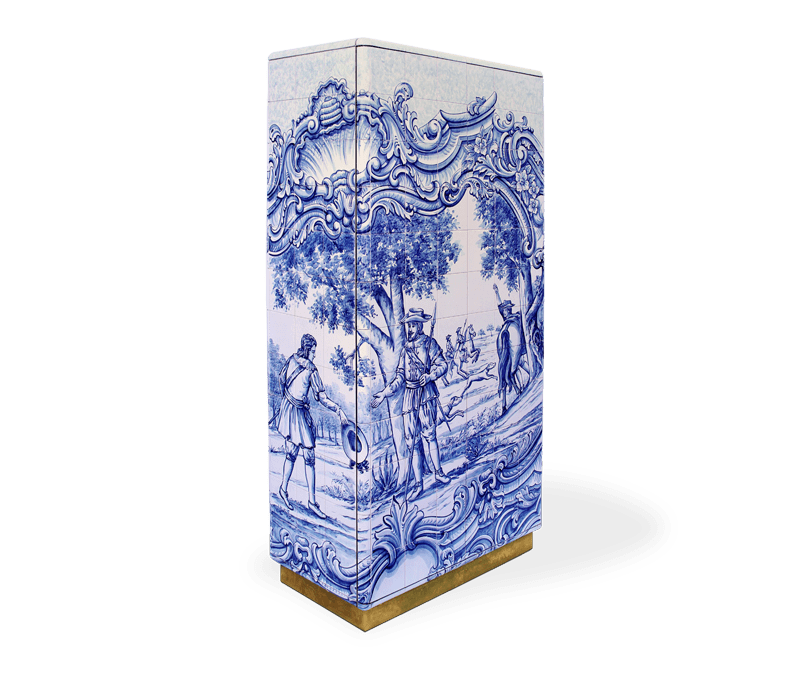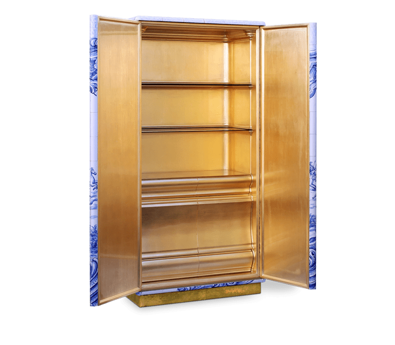 The Heritage Cabinet is a magnificent journey through Portuguese legacy. Covered in Azulejos, traditional hand painted tiles and one of the most representative art forms of Portuguese culture, the architectural cabinet portrays different scenes from the country’s Discoveries era. Centuries of history are gathered in a single final white and blue panel, and each layer is enhanced by vertical mirrors on the lateral surfaces. The hint of wander through the rich legacy continues when two door open to a lined glossy gold leaf interior, and a classical ornament trim reminds the inside of churches and rich buildings. A clear glass shelve can be seen on the two individual divisions of the cabinet. A statement cabinet, the Heritage can take center stage in the most elegant rooms since its back is also fully hand painted. A lengthy tradition of bespoke and exclusivity to make one-of-kind design pieces.