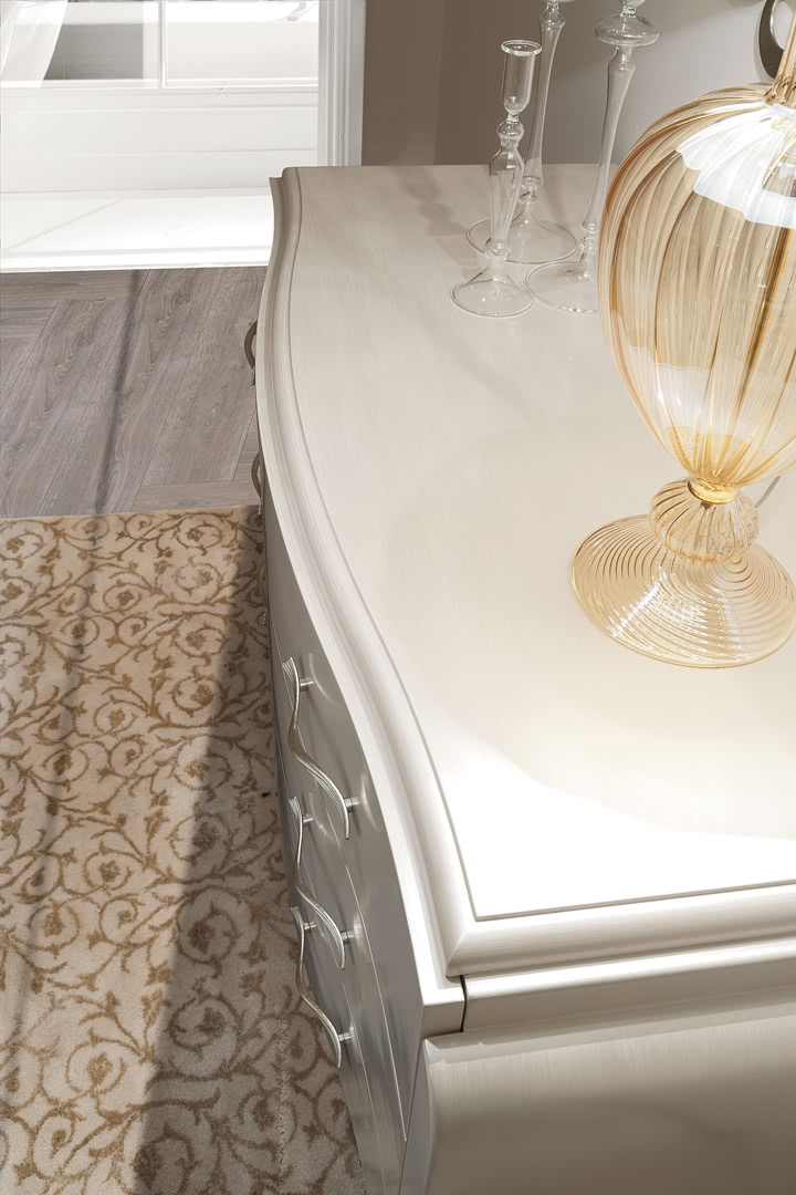 La struttura è decorata in madreperla a pennello o spatolata; le maniglie sono realizzate in metallo con finitura in foglia argento champagne. Il comò Lorenzo insieme ai comodini, crea un gruppo notte perfetto per una camera da letto classica o vintage.