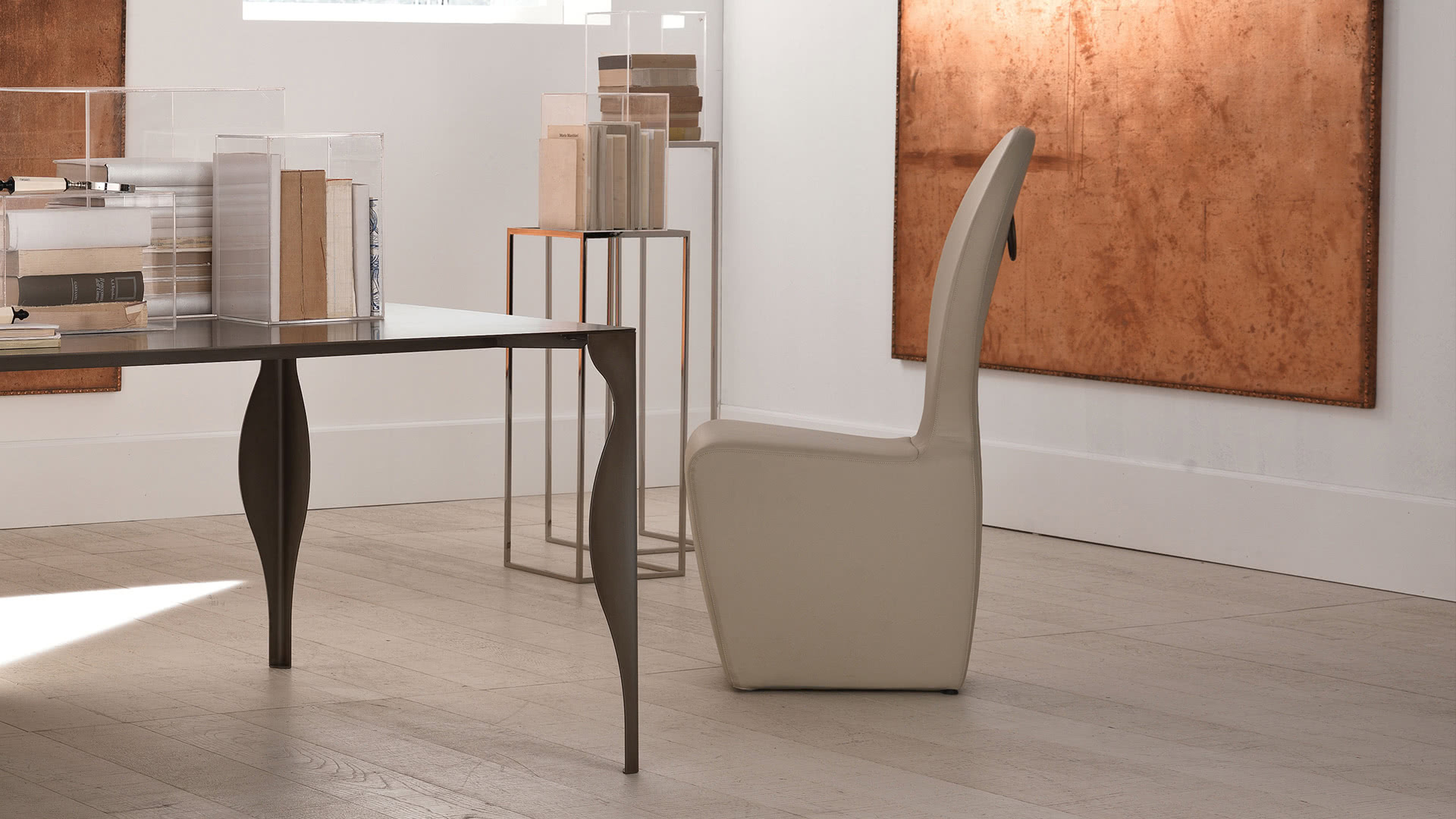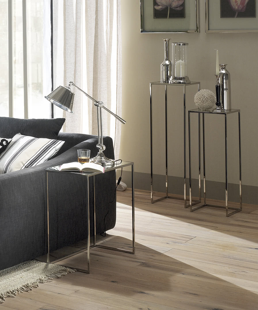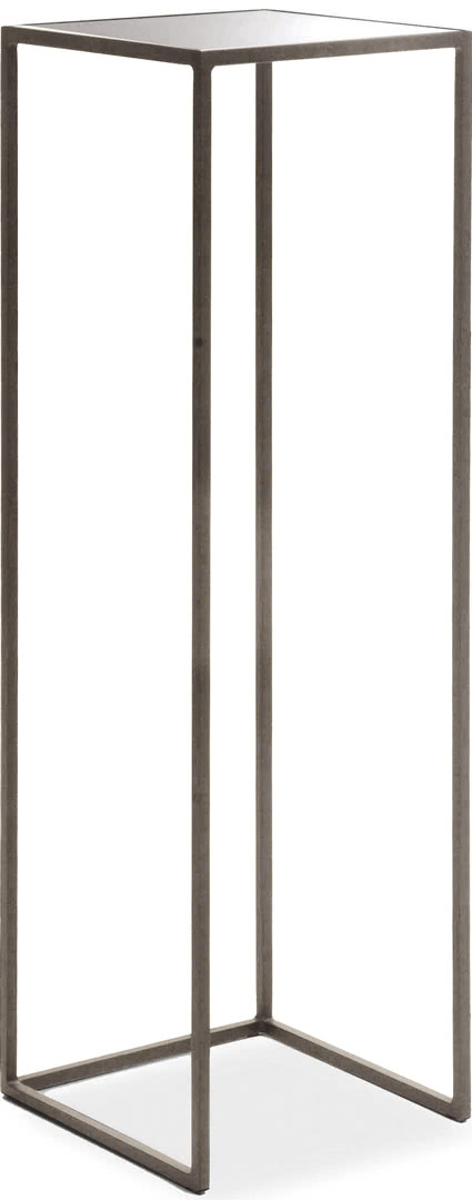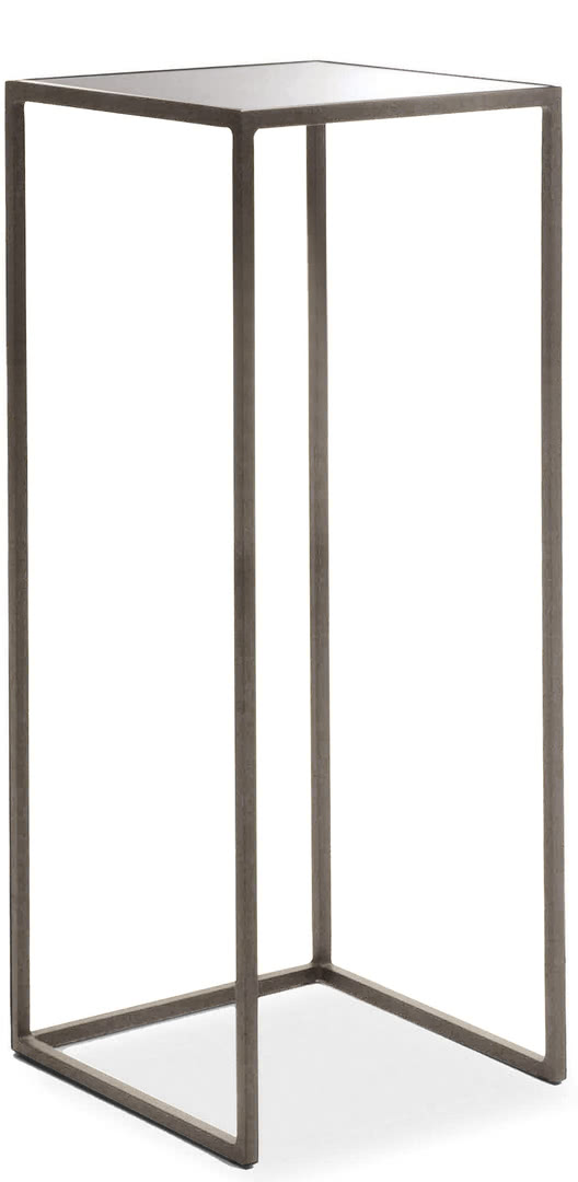 La struttura è in ferro pieno quadro con finitura a bagno di galvanica in ottone spazzolato, nichel nero o in ferro metallizzato. Il top è rivestito in specchio bronzato a filo lucido. Una fioriera dal design moderno con linee pulite disponibile in due altezze: 100 e 80 cm.