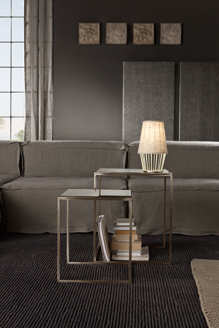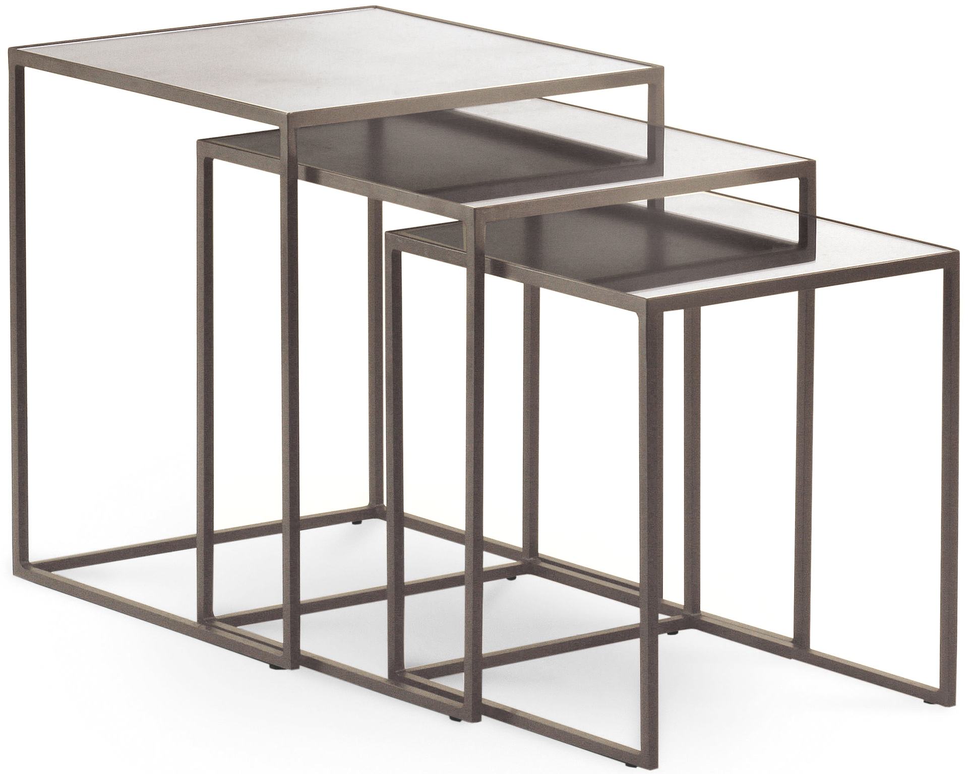 La struttura è in ferro pieno quadro con finitura a bagno di galvanica in ottone spazzolato, nichel nero o in ferro metallizzato. Il top è rivestito in specchio bronzato a filo lucido. Il set di tavolini da divano è vendibile anche singolarmente.