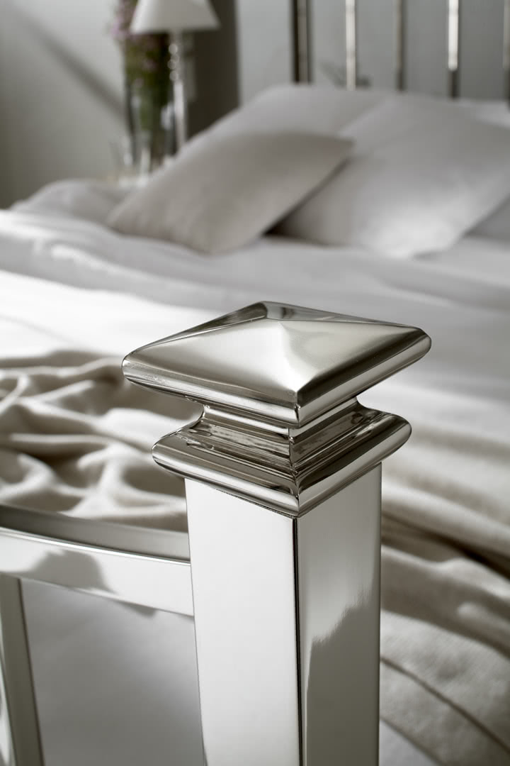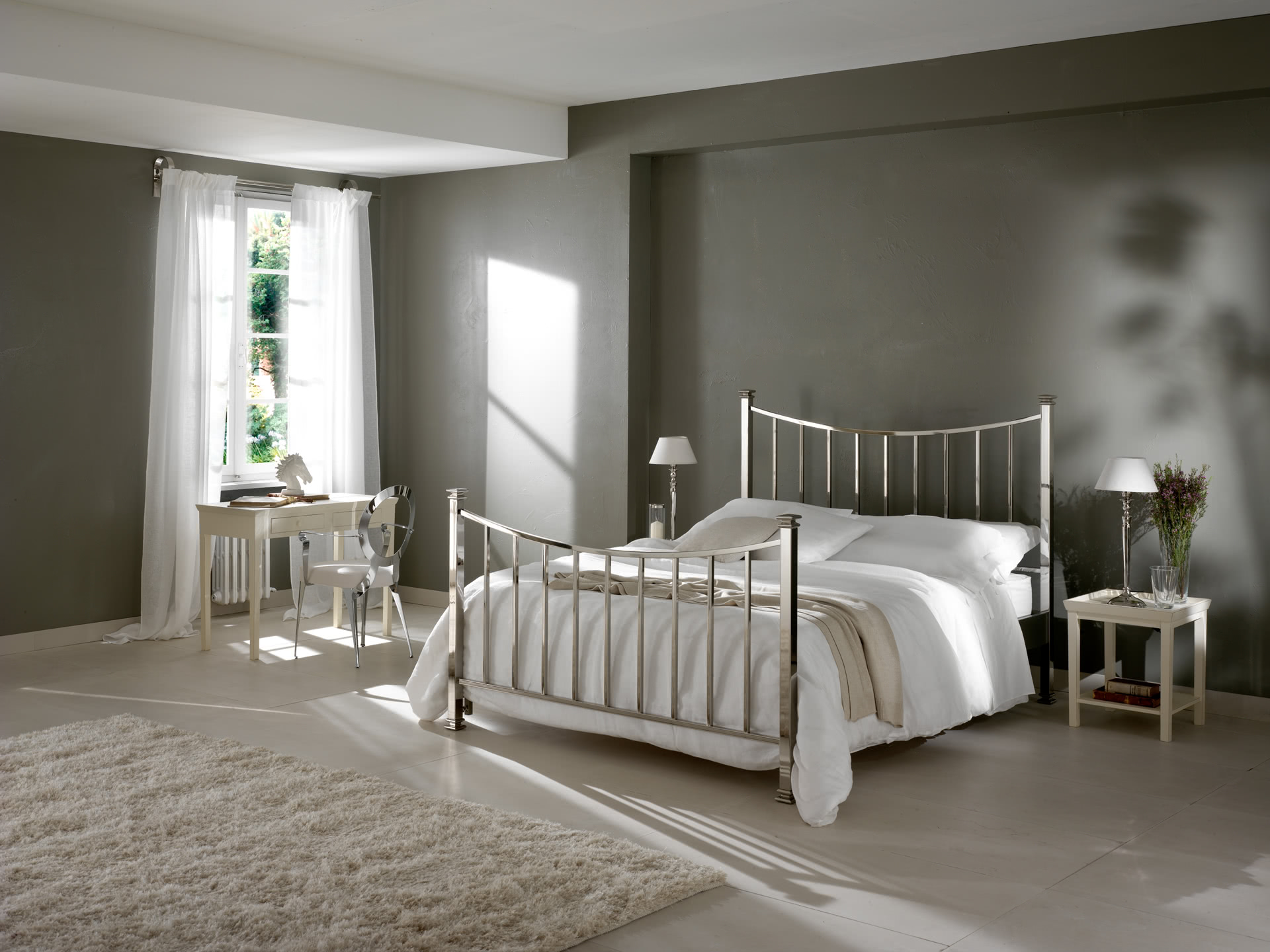 La struttura è realizzata in ferro, curvato e levigato, con particolari in fusione di ottone e assemblaggio con tiranti interni; tutta finita in nichel o in oro. Un letto dal design in stile Inglese dal sapore country ma moderno, perfetto per una camera luminosa. Il letto Alan è disponibile in varie dimensioni per reti da cm: 160x200 (letto matrimoniale) e 180x200 (letto matrimoniale) anche nella versione con box contenitore. Su richiesta, è possibile realizzarlo anche fuori misura per materassi di lunghezza cm 210, 220, 230 o altre dimensioni richieste dal cliente; un letto più lungo per offrire il massimo comfort anche a persone molto alte.