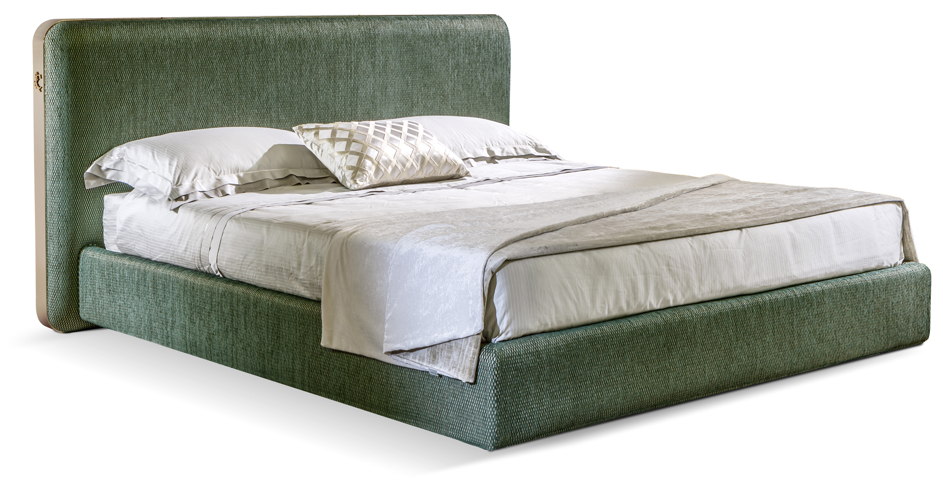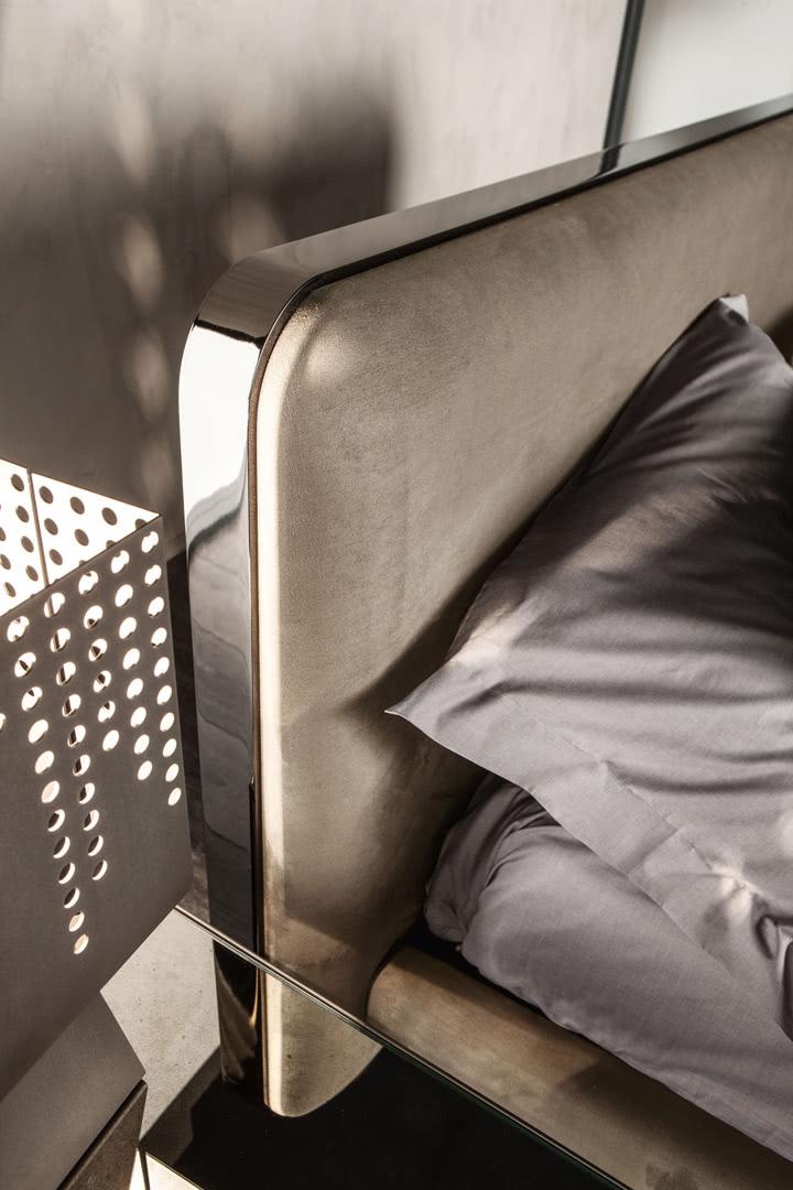 Gli spigoli arrotondati e la cornice sono realizzati in alluminio pieno curvato; la testata e il giroletto sono imbottiti e rivestiti, o impunturati se in pelle, anche in tessuto/pelle fornito dal cliente (il giroletto è sfoderabile). Il letto Elvis, con la sua matrice “streamline” dona un carattere unico alla camera da letto moderna; è disponibile in varie dimensioni per reti da cm: 160x200 (letto matrimoniale), 180x200 (letto matrimoniale) e 200x200 (letto king size) anche nella versione con box contenitore.