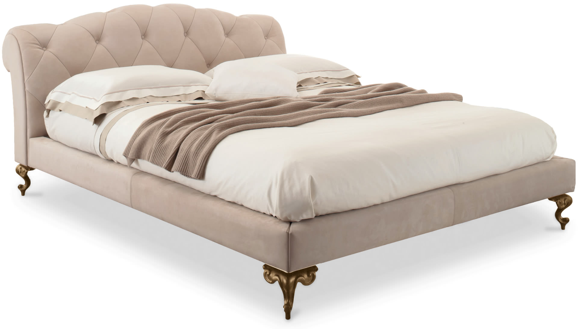 I piedi, in fusione, sono finiti e decorati a mano in foglia argento, oro o champagne. Il giroletto in legno è imbottito e rivestito in tessuto, velluto, pelle o con tessuto/pelle fornito dal cliente (sfoderabile). Un letto dallo stile intramontabile, perfetto come fulcro della camera da letto. Il letto George è disponibile in varie dimensioni per reti da cm: 160x200 (letto matrimoniale), 180x200 (letto matrimoniale) e 200x200 (letto king size).
