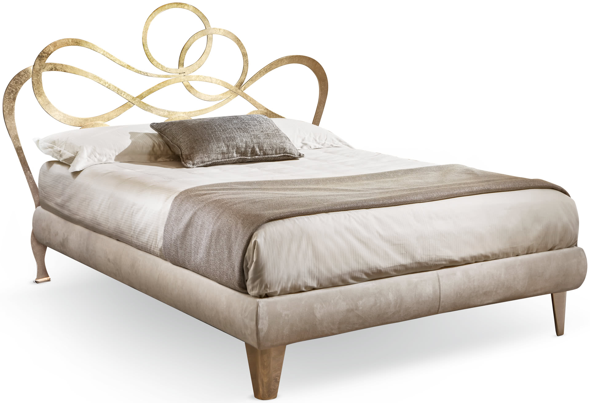 La struttura è realizzata in metallo piatto, tagliato a laser, con saldature a filo e superfici interamente levigate a mano. La finitura in foglia argento champagne è applicata manualmente da esperti artigiani. Il giroletto, con struttura perimetrale in legno e piedi in fusione di alluminio, è rivestito in ecopelle o con un tessuto fornito dal cliente. Letto e gruppo notte perfetto per una camera da letto giovane e romantica. Il letto J’adore imbottito è disponibile in varie dimensioni per reti da cm 140x200 (letto alla francese), 160x200 (letto matrimoniale), 180x200 (letto matrimoniale) e 200x200 (letto king size) anche nella versione con box contenitore.