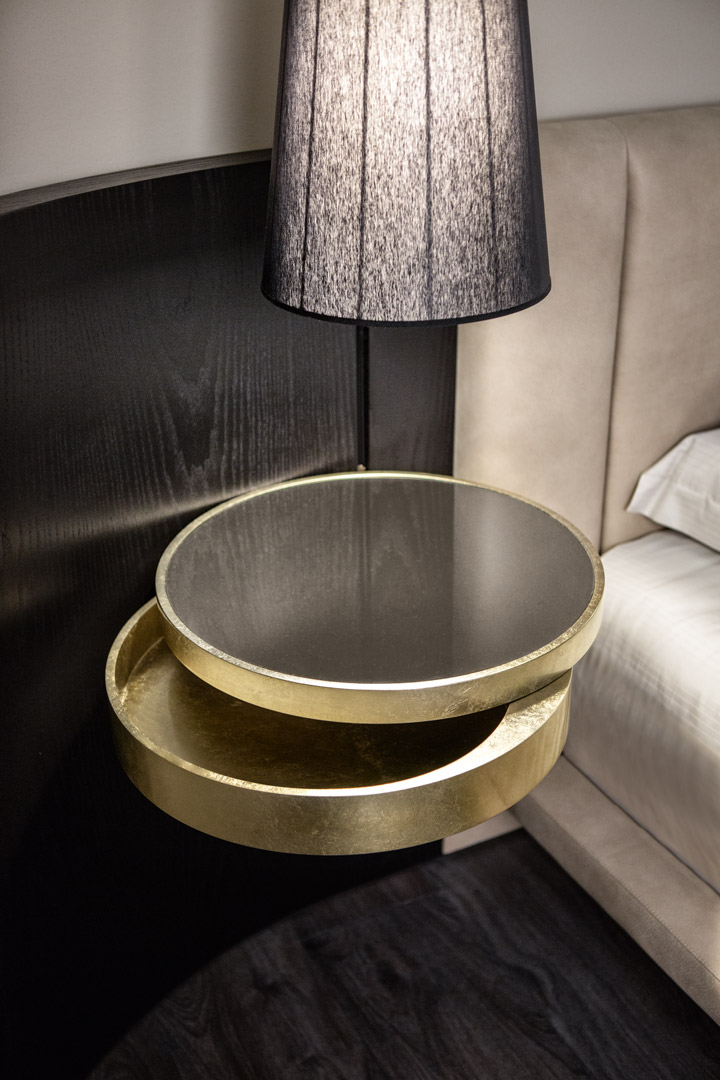 La struttura interna è in legno multistrato e massello di pioppo e faggio, con riporti negli stessi materiali. Il rivestimento strutturale è in poliuretano espanso indeformabile e falda sintetica. La testata ampia, in legno di frassino o noce nazionale impiallacciato, avvolge agli estremi in un rassicurante abbraccio ideale. Il rivestimento della testa e del giroletto è personalizzabile con tessuto, pelle o ecopelle. Interessante l’inserimento dei due piani d’appoggio, uno fisso e l’altro mobile, che grazie alla rotazione permettono un miglior utilizzo. Il letto Mirage con il suo design dona un carattere unico alla camera da letto.