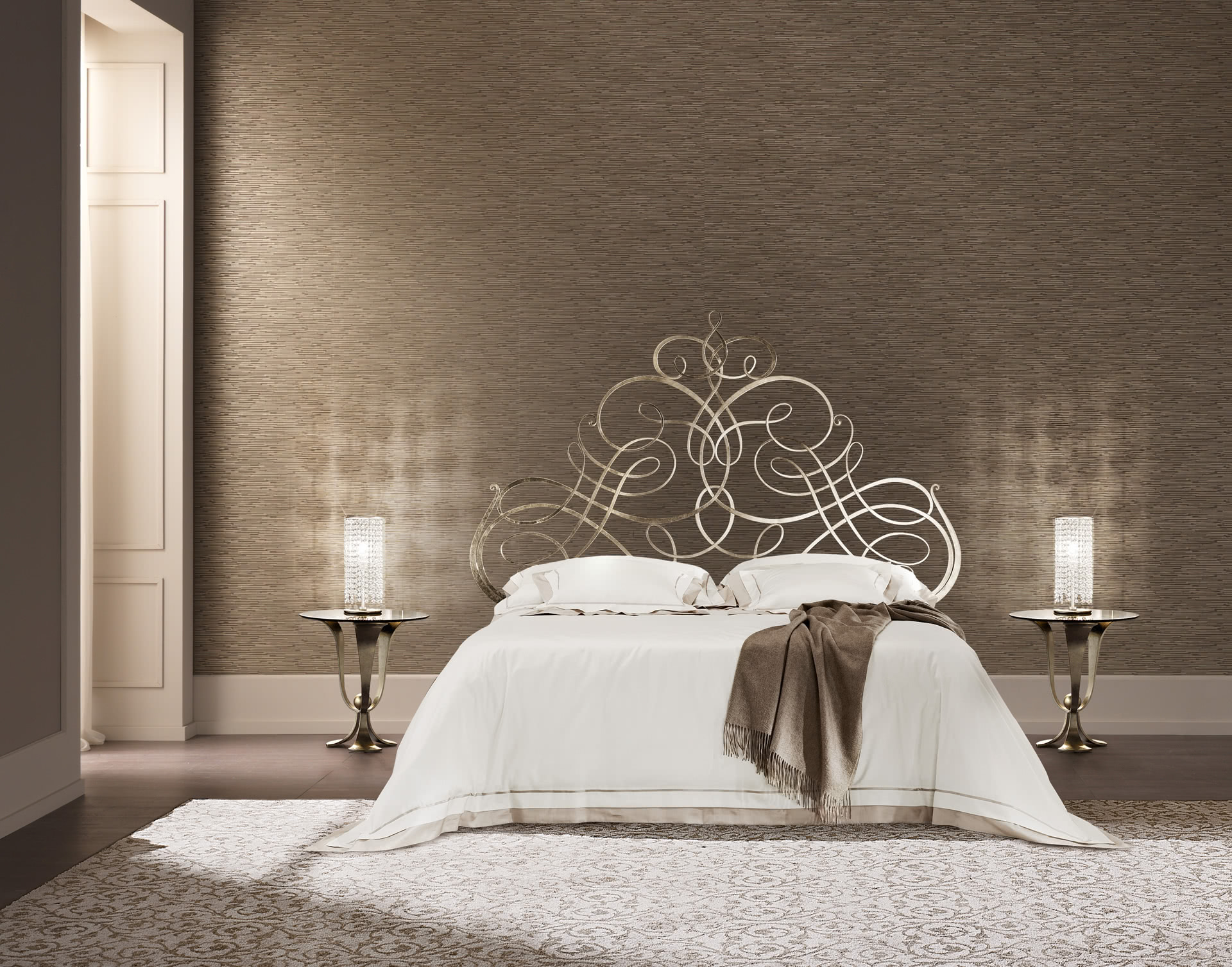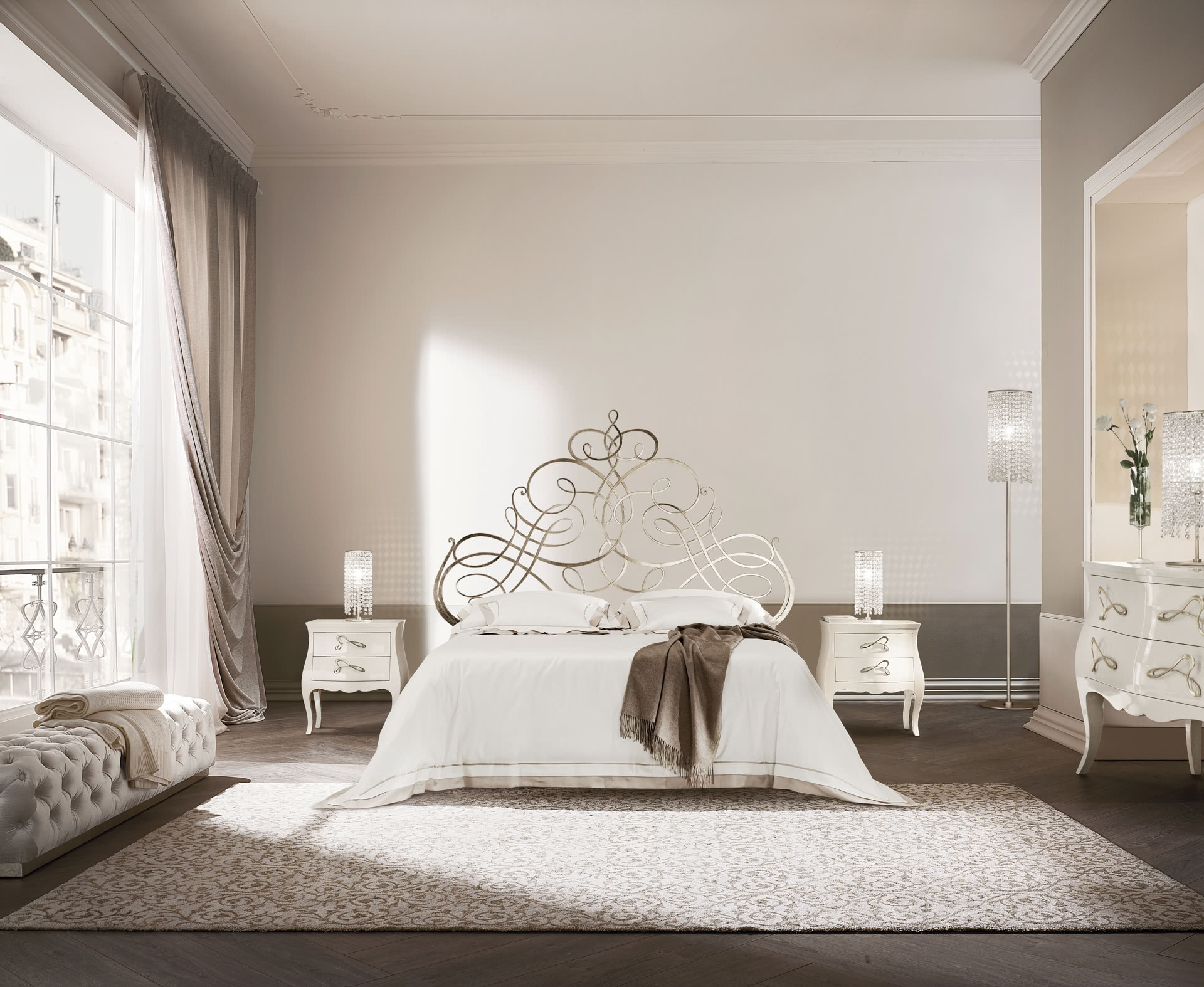 La struttura è in metallo, tagliato a laser, completamente levigata, lucidata e finita a mano in foglia argento champagne o laccata. Il letto Pascià è perfetto per una camera da letto eclettica; è disponibile in varie dimensioni, con o senza pediera, per reti da cm: 160x200 (letto matrimoniale), 180x200 (letto matrimoniale, solo per la versione senza pediera) e 200x200 (letto king size, solo per la versione senza pediera) anche nella versione con box contenitore. Su richiesta, il letto Pascià è disponibile anche fuori misura per materassi di lunghezza cm 210, 220, 230 o altre dimensioni richieste dal cliente; un letto più lungo per offrire il massimo comfort anche a persone molto alte.