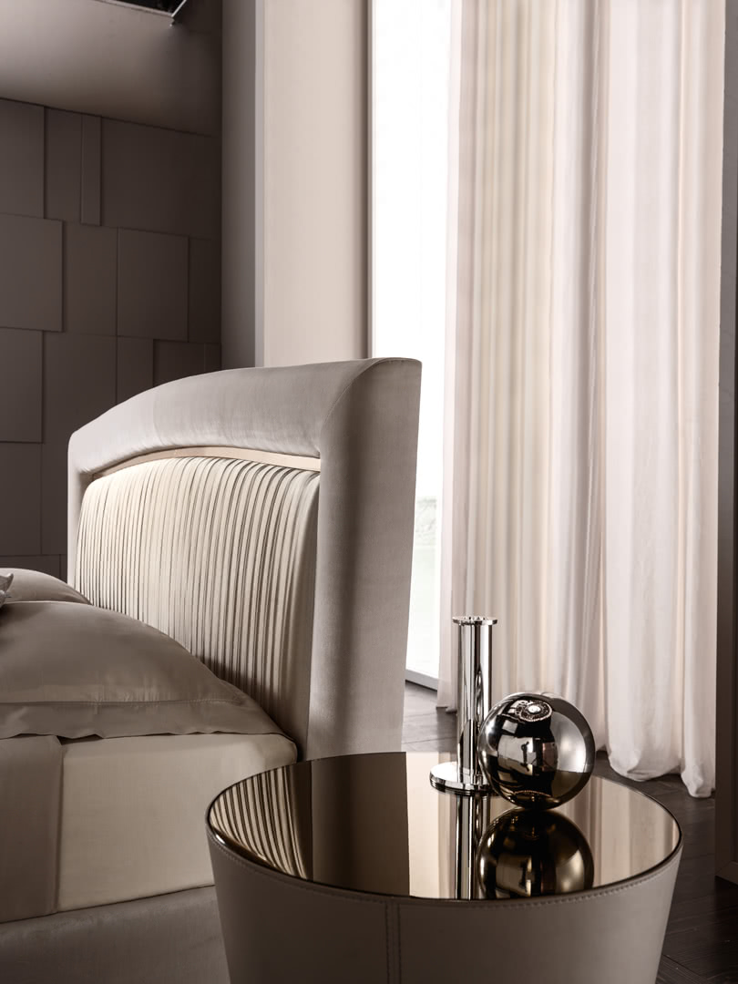 La struttura è imbottita e rivestita, a mano con lavorazione sartoriale, in raso plissettato abbinato al velluto, tessuto, pelle, ecopelle o a un tessuto fornito dal cliente. Il suo design pulito è impreziosito dal doppio tessuto e dal dettaglio in oro. Il letto Portofino Plissè fa da corona ad una camera da letto classica e internazionale; è disponibile in varie dimensioni per reti da cm: 160x200 (letto matrimoniale), 180x200 (letto matrimoniale) e 200x200 (letto king size) anche nella versione con box contenitore.