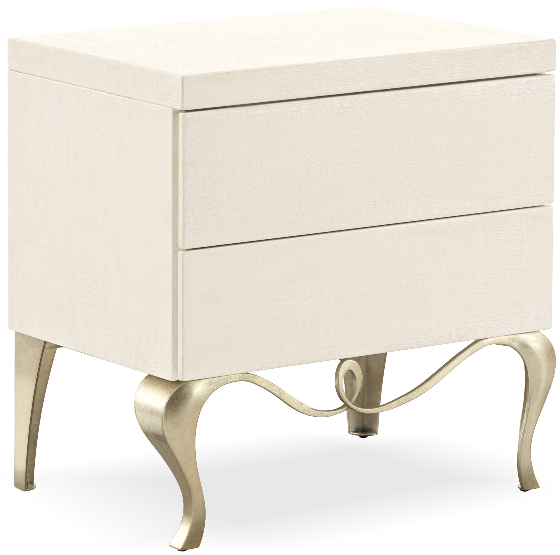 La struttura in legno presenta 2 cassetti con guide ad estrazione totale e richiamo frenato. I piedi e il telaio sono realizzati in ferro, decorati in foglia argento champagne. I comodini Ghirigori, insieme al comò, creano un gruppo notte elegante e unico.