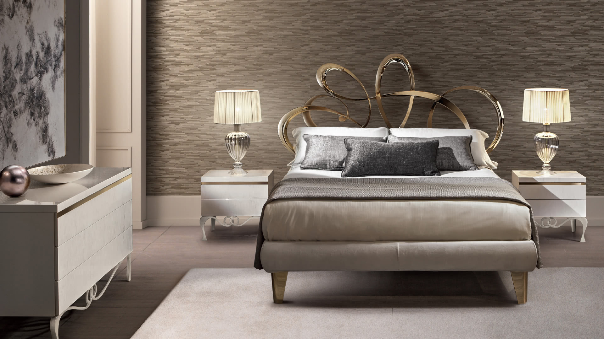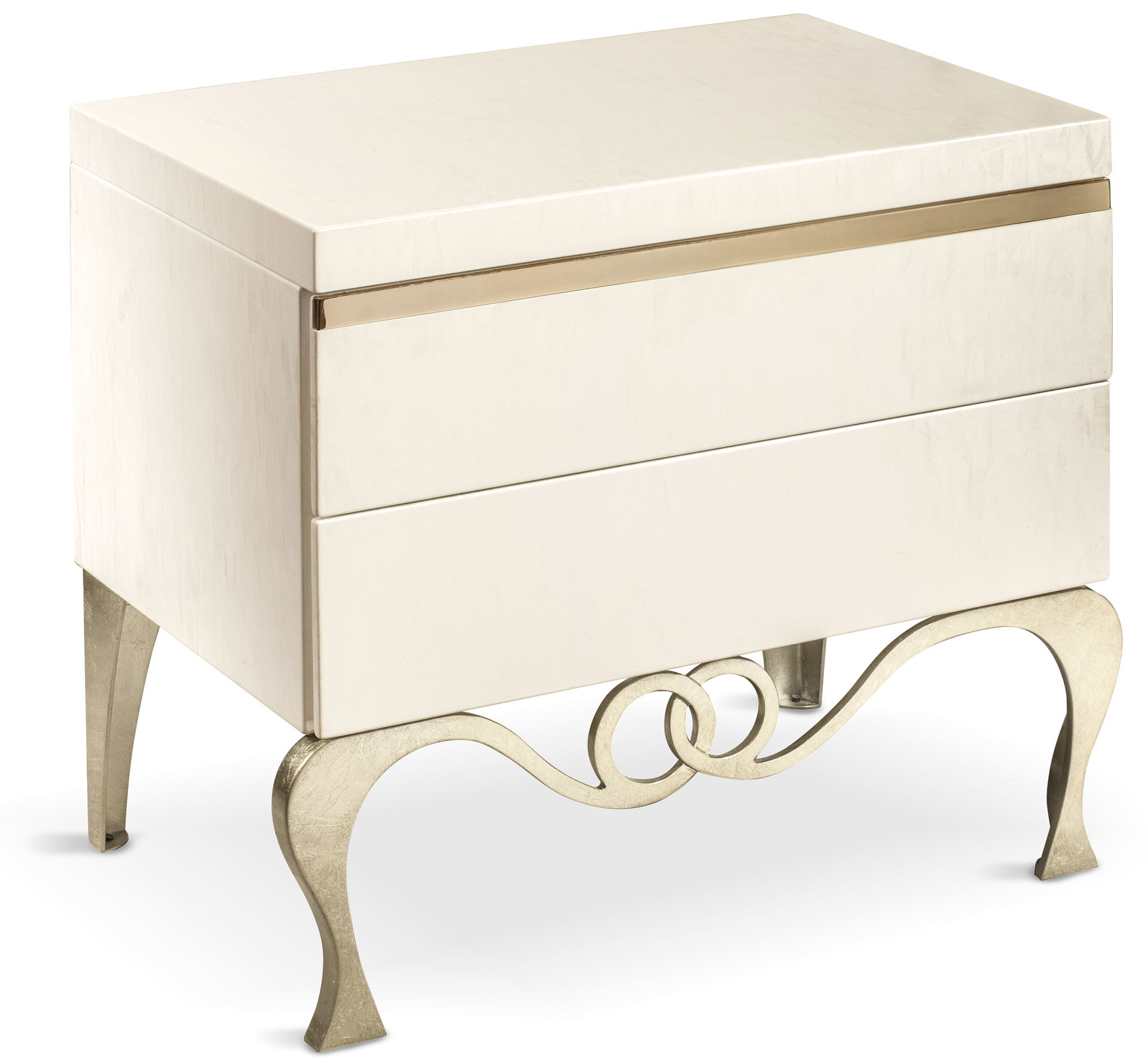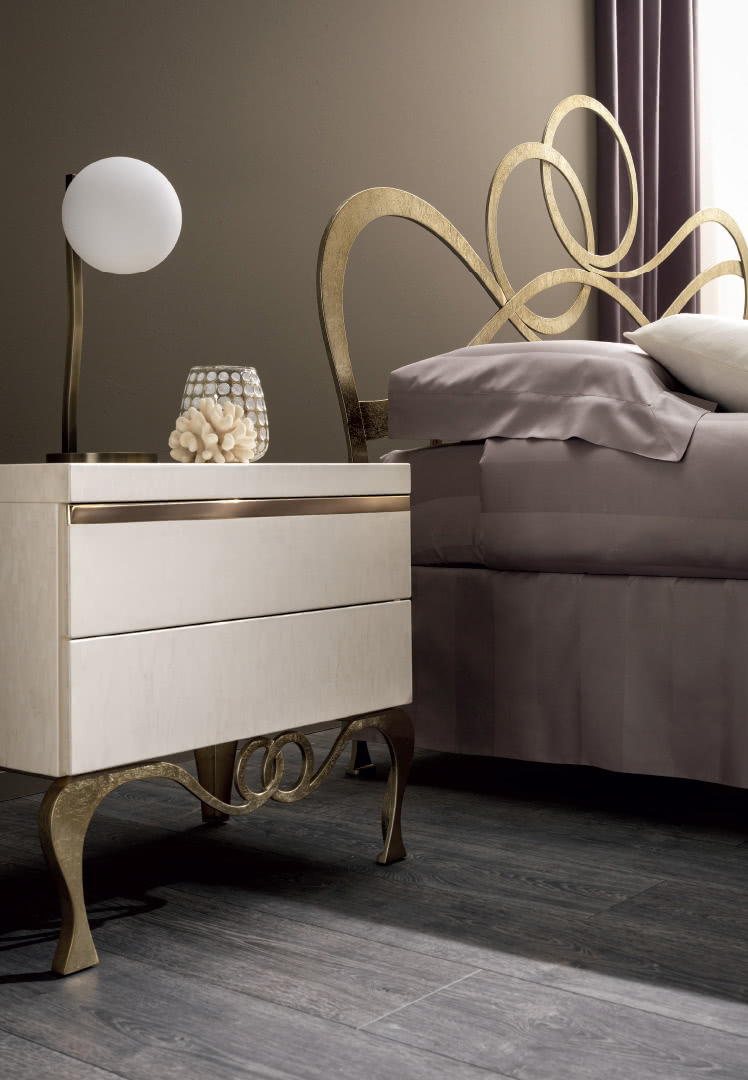 La struttura in legno presenta 2 cassetti con guide ad estrazione totale e richiamo frenato. I piedi e il telaio sono realizzati in ferro, decorati in foglia argento champagne. I comodini J'Adore, insieme al comò, creano un gruppo notte elegante e unico.