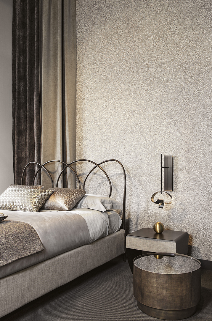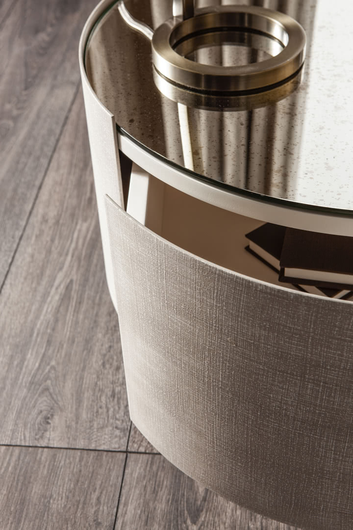 La base, con un cassetto a scomparsa, è decorata in bronzo mentre il top è realizzato in specchio fumé bronzo. Dei comodino dal design moderno e pulito che, insieme al comò, creano un gruppo notte elegante e unico.
