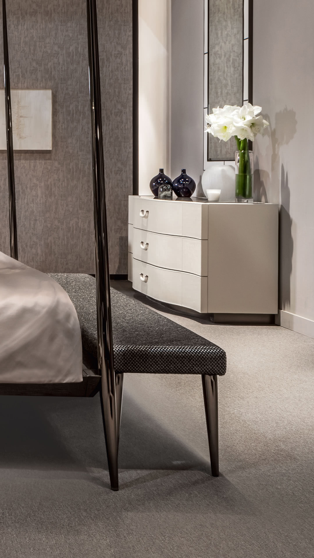 La struttura in ferro, conificato a freddo e lucidato a mano, è realizzata in finitura a bagno di galvanica in oro o nichel nero. La seduta, in legno sagomato, è imbottita in gomma a due densità e rivestita sartoriale anche con tessuto fornito dal cliente. I dettagli nel perimetro sono realizzati in passamaneria. Perfetta come fondo letto in camera.