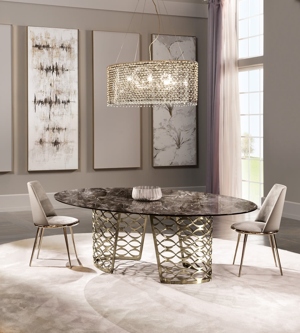 La struttura è finita in foglia argento champagne, realizzata a mano; il paralume, realizzato con pendenti di vetro a due colori tagliati diamante e montati a mano, regalano un gioco di luci unico alla sala e alla camera da letto. Un lampadario da tavolo dal gusto eclettico, perfetta sia per un arredamento classico che moderno.