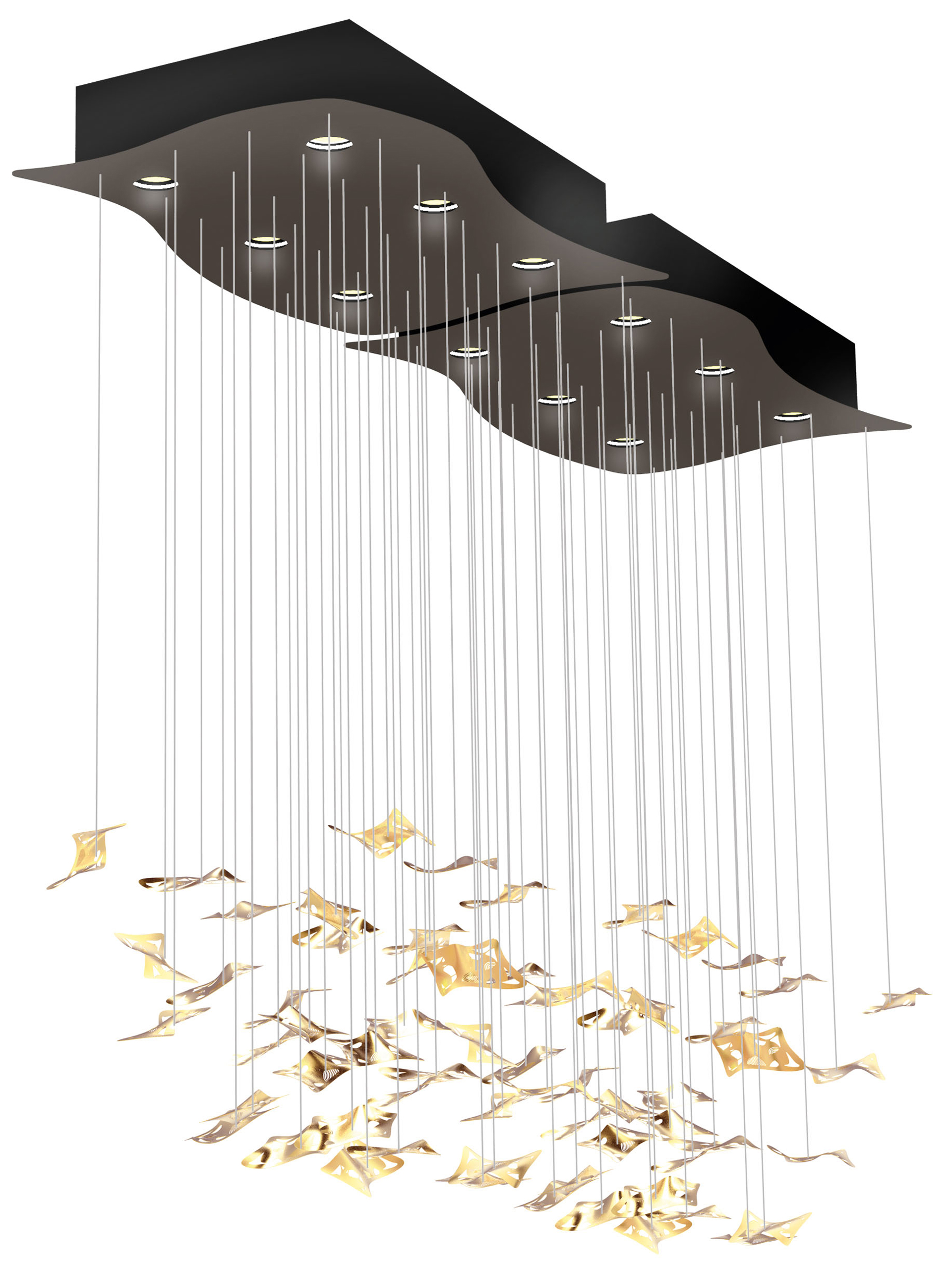 La plafoniera è costituita da una struttura metallica con una parte cilindrica, nera opaca, e una sagomata, in ottone; gli elementi sospesi sono realizzati con la tecnologia della fotoincisione chimica e tenuti da cavetti trasparenti, di altezza personalizzabile. Ogni elemento sospeso è indipendente dal suo vicino, tuttavia il movimento del singolo trasmette il moto agli elementi vicini creando quindi un “comportamento” uniforme. Il design di questi elementi gioca sul dettaglio delle superfici disegnate per ottenere trasparenze e giochi di riflessi. Un design moderno e sofisticato per un lampadario a sospensione perfetto per la sala.