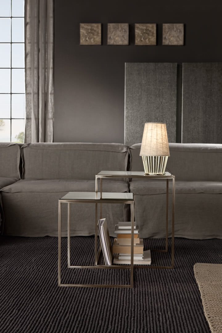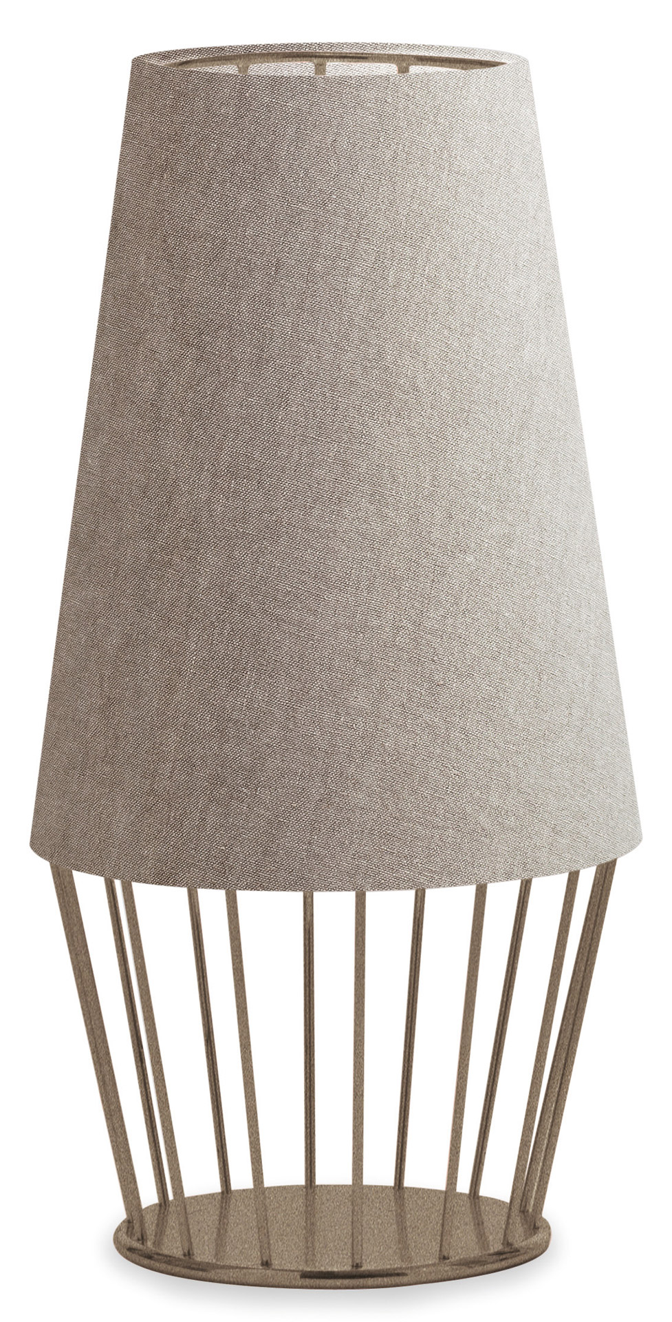 La struttura a gabbia è realizzata in tondino di acciaio e fusione di ottone, con saldature a filo e ottone, e finitura in galvanica oro, rame, nichel nero o ferro metallizzato. Il paralume a tronco di cono è in cotone o lino accoppiato. Una lampada da tavolo dal design moderno ma adatta ad ogni stile, perfetta per la camera da letto, sopra il tavolo in soggiorno, la sala o l’ingresso.