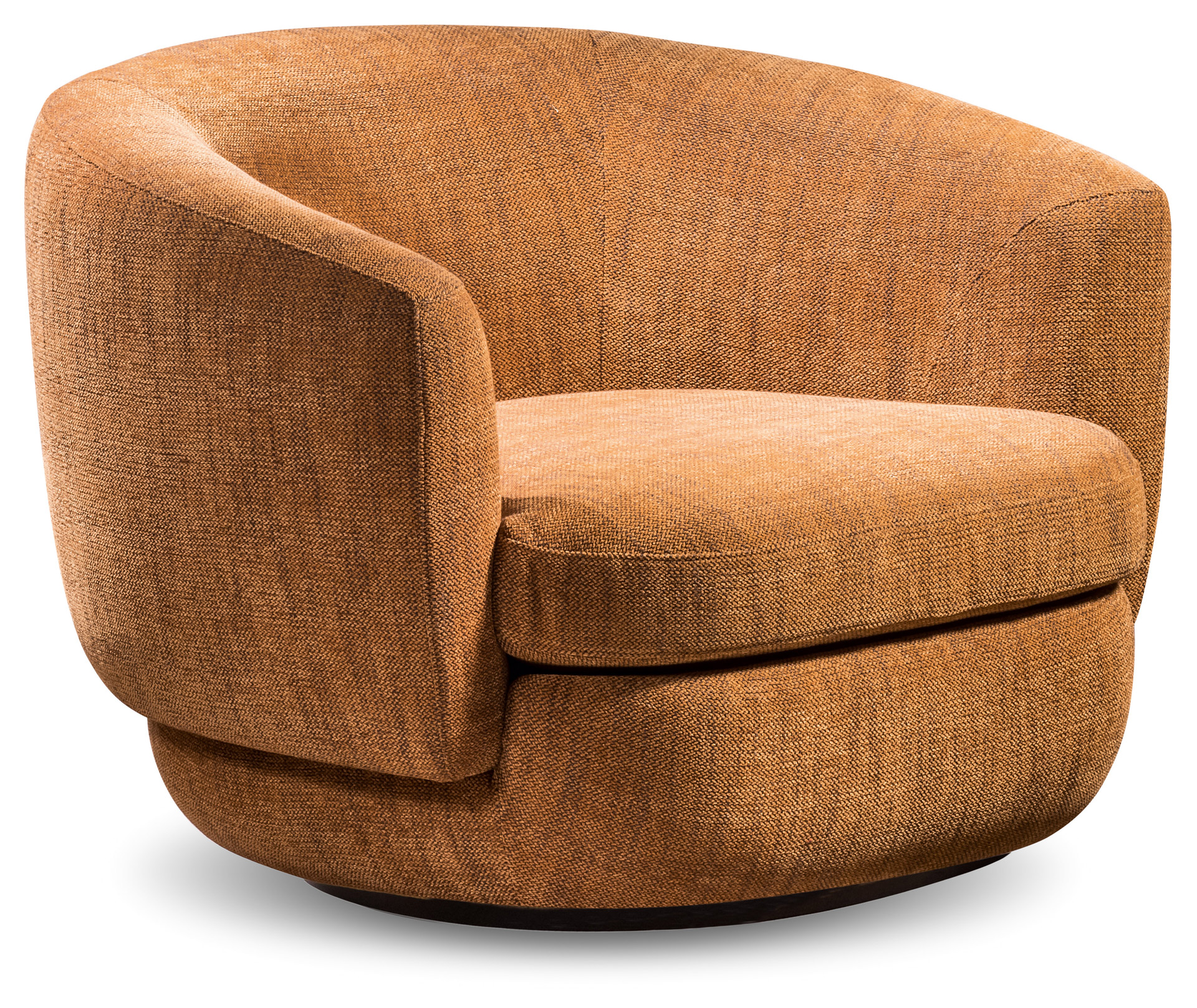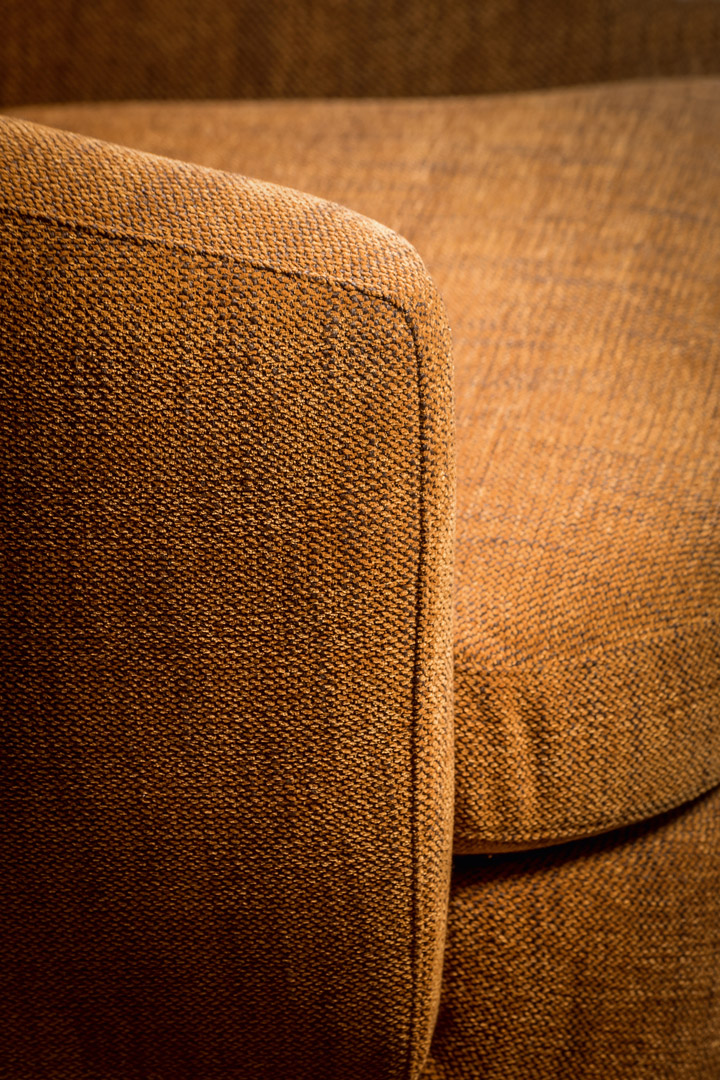 La struttura è in legno massello in faggio e pioppo con inserti in multistrato, il molleggio è garantito da cinghia elastiche indeformabili. Il rivestimento strutturale è in poliuretano espanso a quote differenziate ad alta densità e lo strato superiore ad alta componente elastica, la cuscinatura è a densità differenziata indeformabile in piuma e falda sintetica. Il basamento girevole in metallo decorato sottolinea le curve di questa poltrona dalle dimensioni perfette per affiancare un sofà moderno, o diventare protagonista di un piccolo living o di una camera da letto.