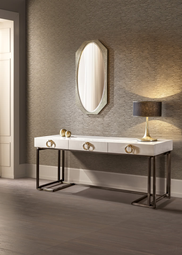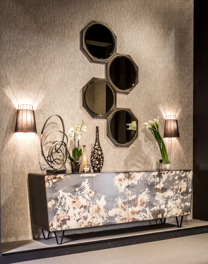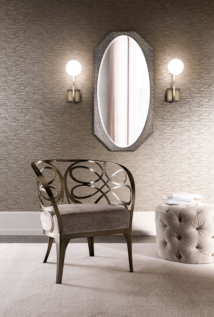 Lo specchio è argentato a doppio fondo e molato; la cornice ottagonale, in ferro pieno battuto a mano, è disponibile sia decorata artigianalmente che a bagno di galvanica bronzo. La specchiera Marylin può essere appesa sia in verticale che in orizzontale in camera da letto, in sala, nell'ingresso o in un bagno raffinato.