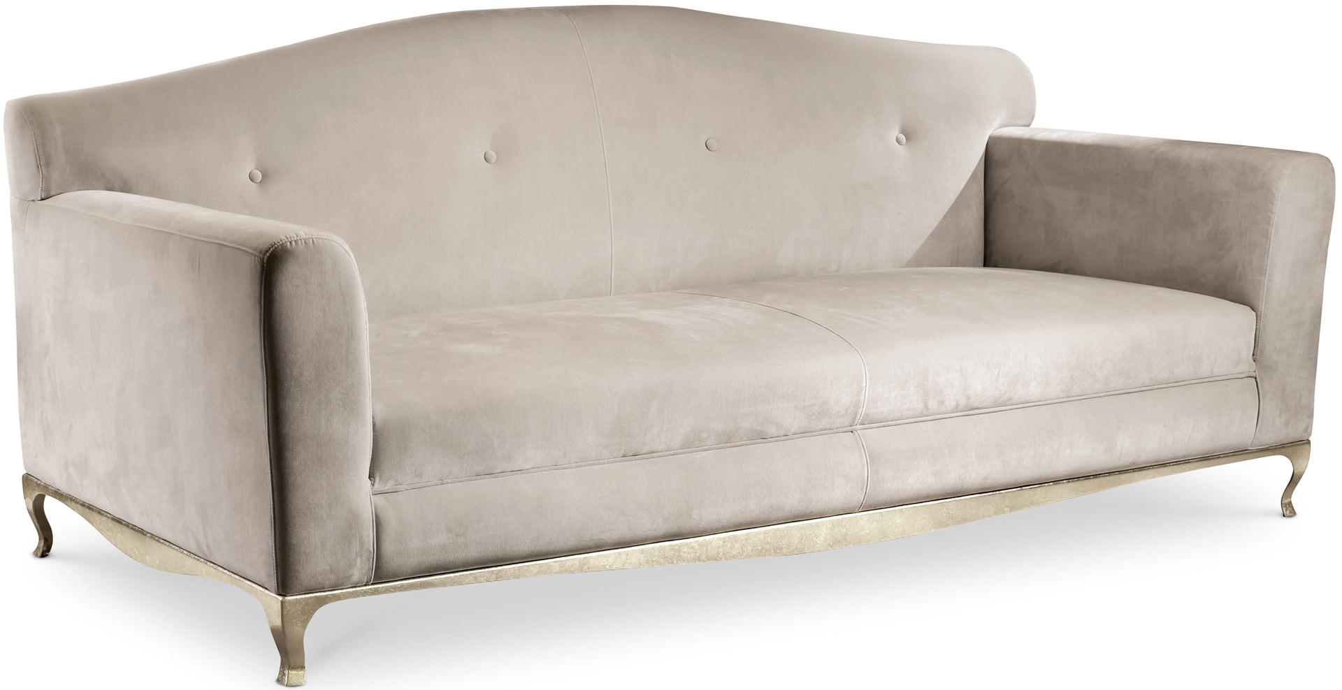 La struttura è in legno multistrati e il molleggio è garantito da cinghie elastiche ad alta componente di caucciù. Il rivestimento strutturale è in poliuretano espanso a quote differenziate ad alta densità e lo strato superiore ad alta componente elastica che, aggregato allo strato inferiore, garantisce una migliore morbidezza nel tempo. Il basamento in metallo, tagliato a laser e curvato, unisce i piedi decorati in foglia o in bronzo patinato. L'imbottitura è realizzata in gomma a tre densità mentre il rivestimento sartoriale è realizzabile in tessuto, velluto, pelle o con tessuto/pelle non sfoderabile fornito dal cliente. Su richiesta è possibile realizzare un rivestimento sfoderabile. Caratterizzato da linee sinuose e decise, è un divano versatile per tutti i tipi di arredamento. L’andamento curvilineo e il disegno distintivo rendono il sofà unico nel suo genere e suggeriscono un senso immediato di relax.