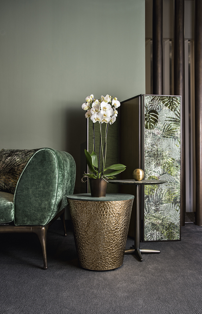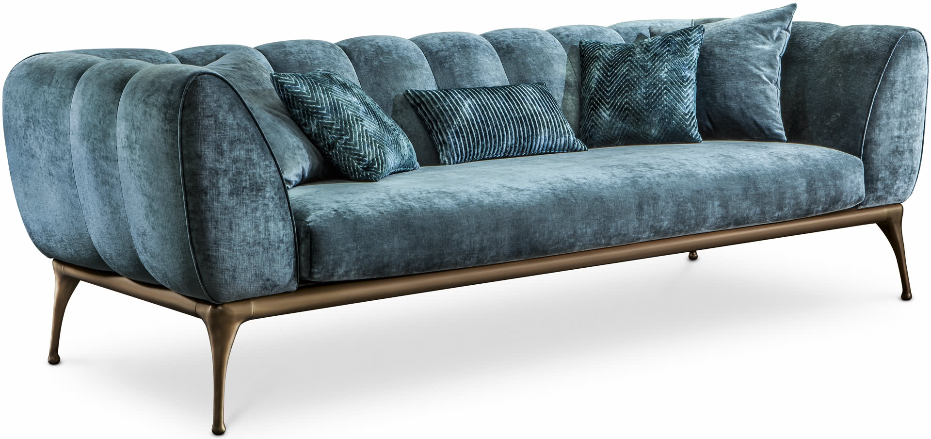 La strutta perimetrale è realizzata in alluminio con i piedi in pressofusione. Il molleggio è garantito da cinghie elastiche su telaio in acciaio. La struttura dello schienale e dei braccioli è realizzata in legno multistrato rivestito in poliuretano espanso a quote differenziate ad alta densità e lo strato superiore ad alta componente elastica che, aggregato allo strato inferiore, garantisce una migliore morbidezza nel tempo. La seduta in legno, imbottita in gomma a densità variabile, ad alta resilienza, è rivestita sartorialmente, con trapuntatura verticale, in tessuto, velluto, pelle, ecopelle o con tessuto/pelle fornito dal cliente. Un divano dalle linee morbide e senza tempo per arredare con stile il proprio living rendendolo accogliente.