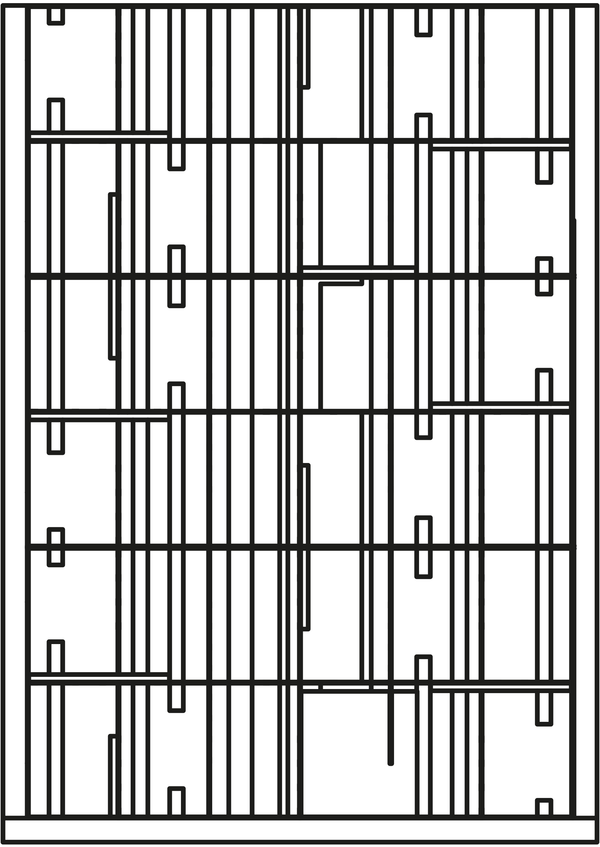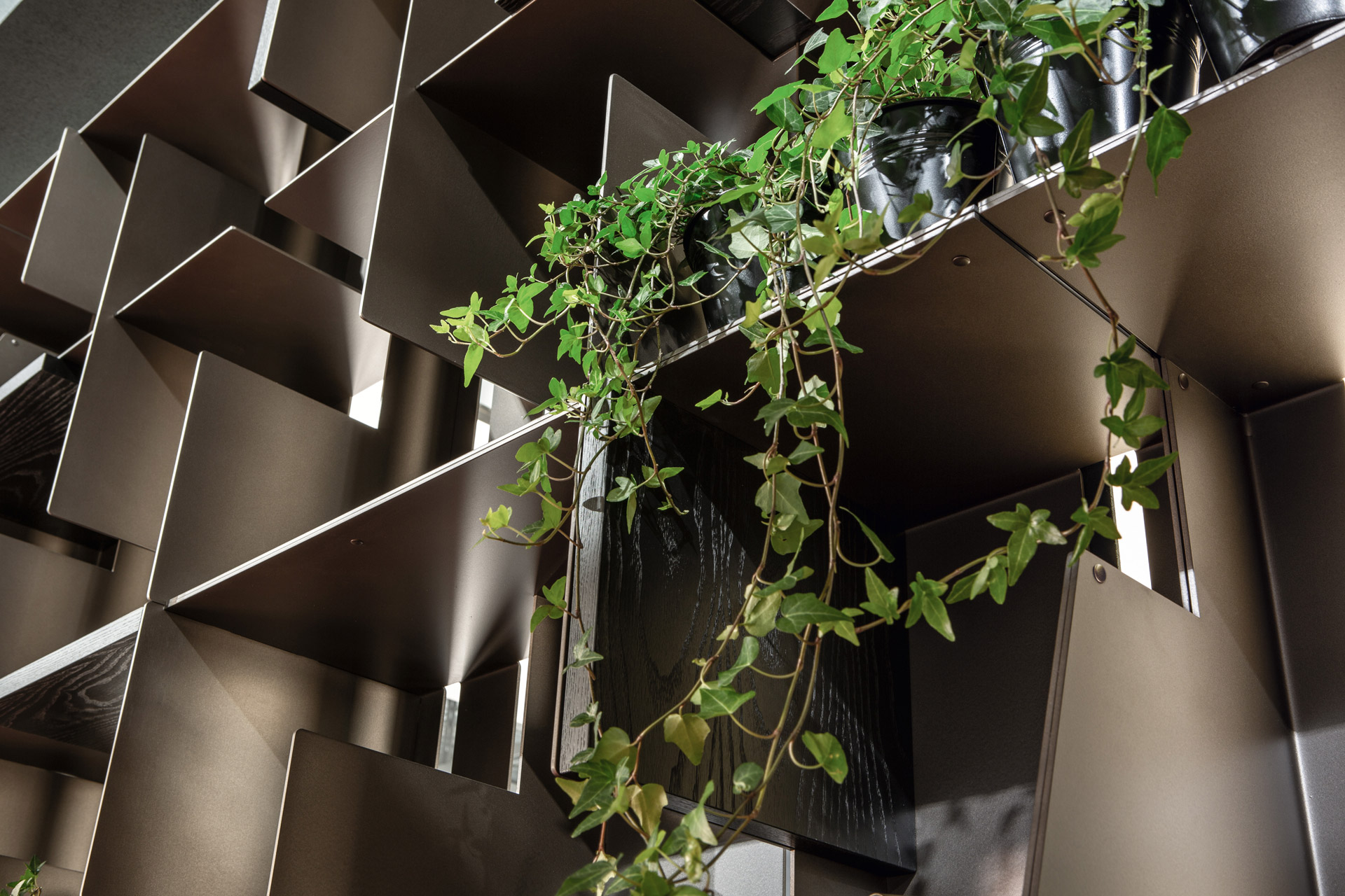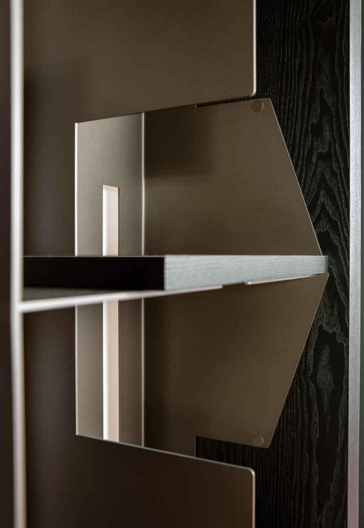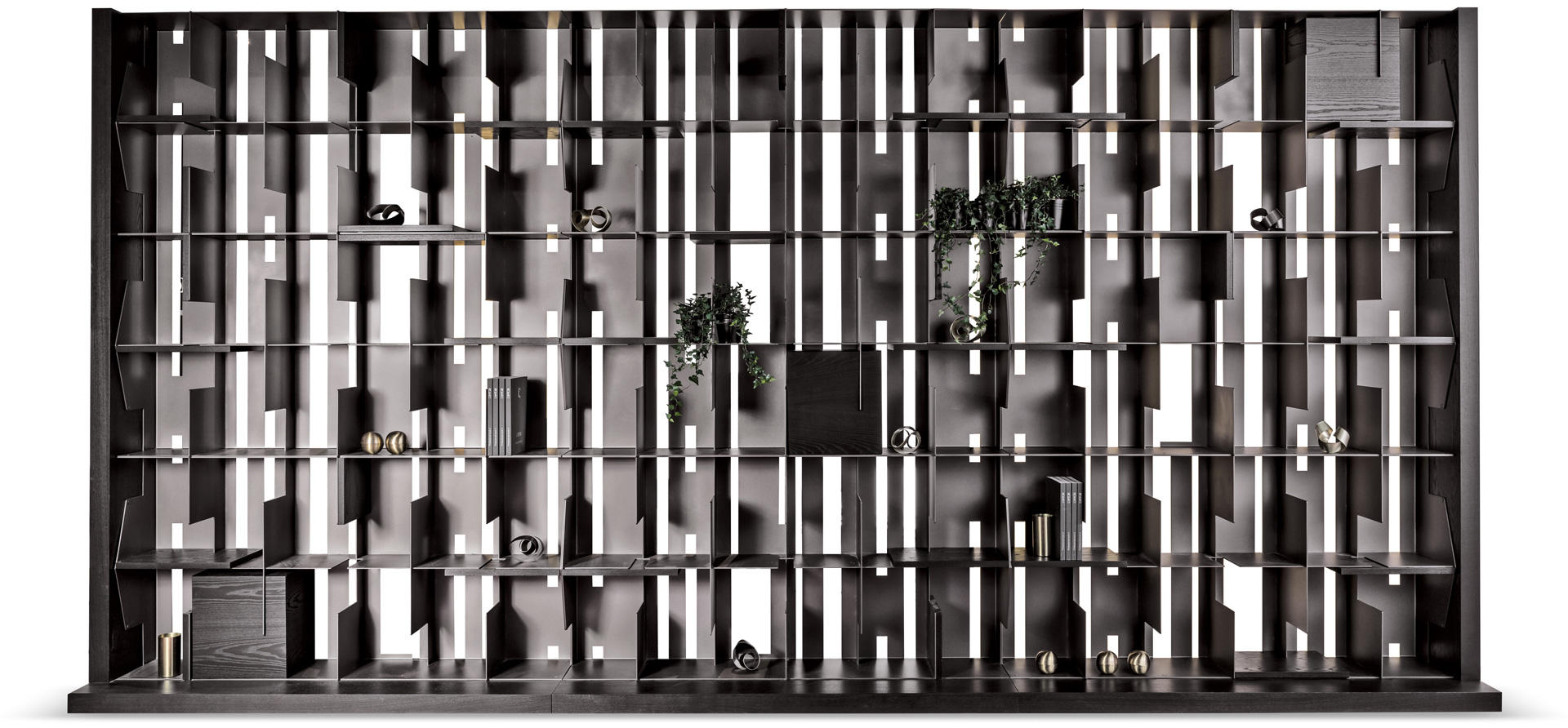 La base e i fianchi portanti sono realizzati in legno multistrato impiallacciato frassino. Ogni modulo può essere personalizzato da un piano in legno, usato sia come mensola che come decoro, oppure da cubi contenitori con anta a ribalta, da posizionare a piacimento, rendendolo un’opera sempre unica. Gli elementi strutturali non sono nascosti ma, anzi, esaltati fino a divenire essi stessi connotazione stilistica della composizione insieme tipico del design post industriale. Legno e alluminio collaborano attivamente alla continuità della struttura componibile dove il singolo modulo diventa cellula costituente amalgamata nella totalità dell’insieme. La libreria Hong Kong può fungere anche da parete divisoria. L’insieme delle fessure disegnate nello schienale crea giochi di luce che delineano e esaltano la struttura.