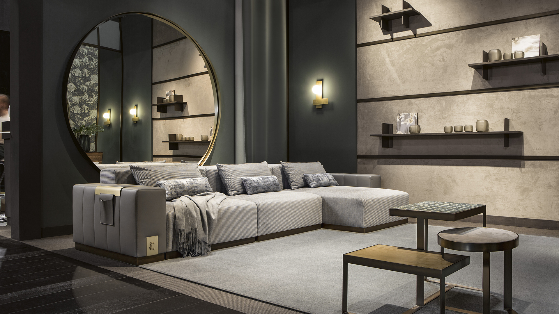 Sistema di libreria componibile, da appendere a parete, formata da mensole in legno massello, disponibili in quattro diverse lunghezze, e supporti con uno o due vani per ripiani, realizzabili in ottone spazzolato o ferro patinato. Finiture ricercate e materiali forti per una libreria che diventa un disegno grafico decorativo.