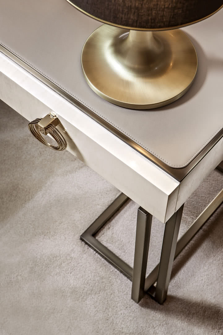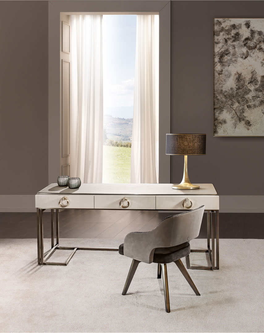 La base è finita in bronzo mentre il piano removibile è in legno rivestito in pelle. Le maniglie gioiello, finite oro pallido, sono realizzate interamente a mano e prendono ispirazione dai battenti delle porte e dai bracciali a più giri; inoltre impreziosiscono ulteriormente la finitura spatolata e la base bronzata della scrivania, ammorbidendone le linee squadrate dal design rigoroso.