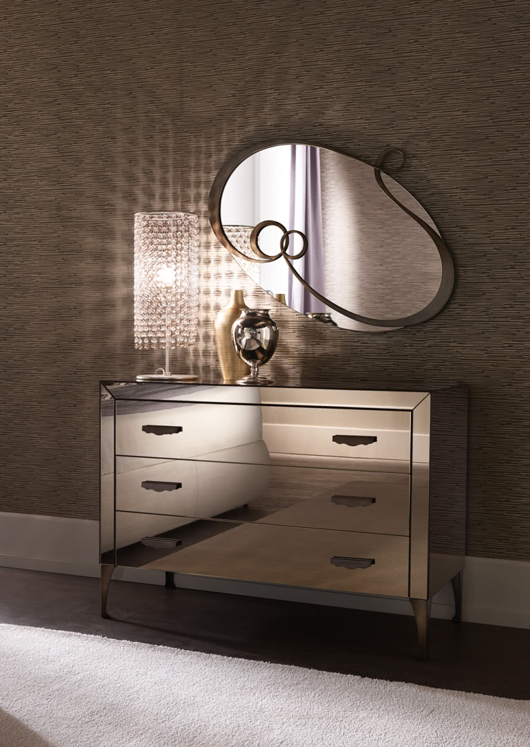 Presenta 3 cassetti con guide ad estrazione totale e richiamo frenato. Tutto rivestito in specchio molato con maniglie e piedi in metallo o in bronzo. Un comò dal sapore vintage che, insieme ai comodini, crea un gruppo notte perfetto anche per una camera da letto classica o vintage.