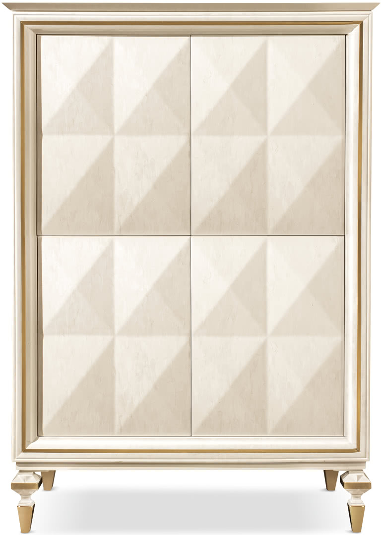 Internamente il mobile è diviso con due ripiani in vetro. Le bugne sulle ante formano un taglio a forma di diamante, che riflette la luce fornendo toni diversi alla decorazione in madreperla mentre la cornice in legno con intarsio in oro ne risalta la lavorazione artigianale. Anche i piedi in legno sono realizzati per formare un gioco di facce e luce.