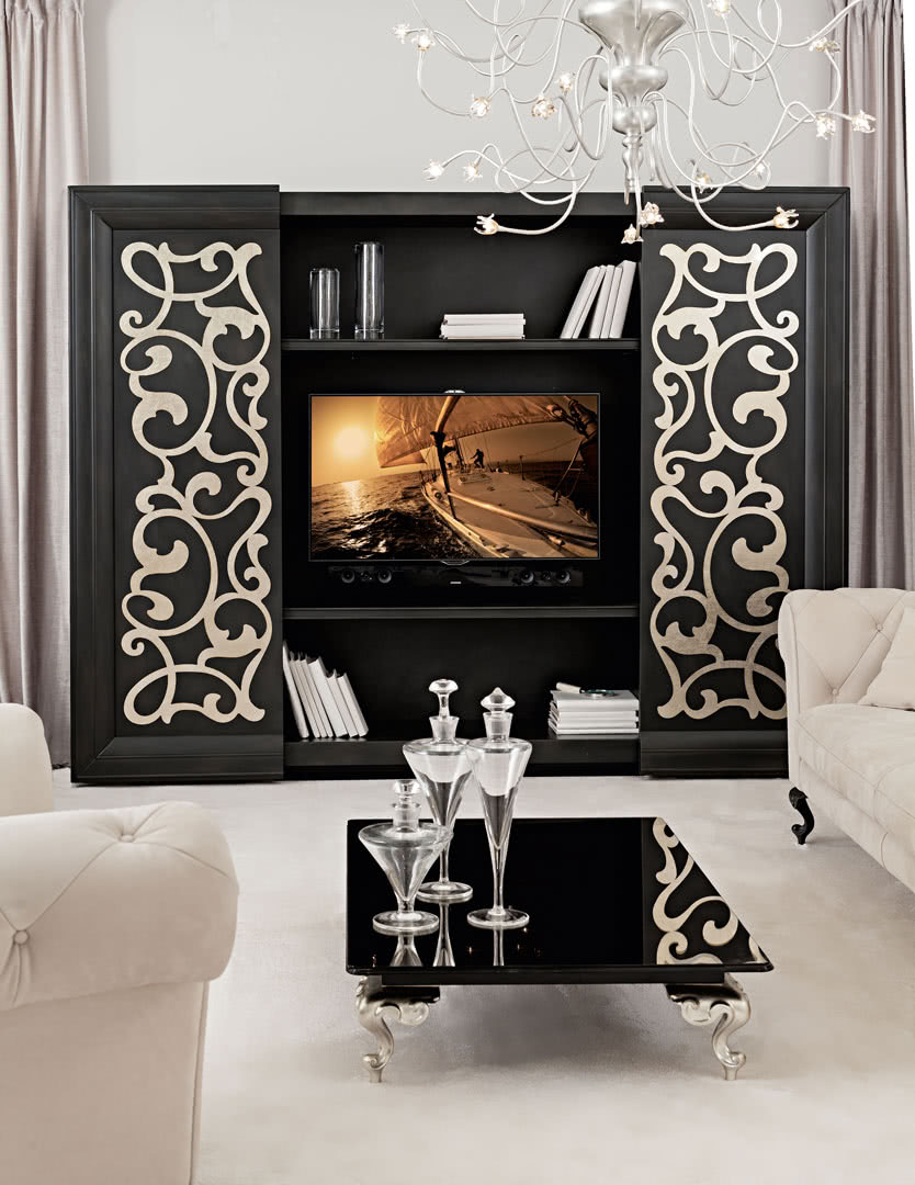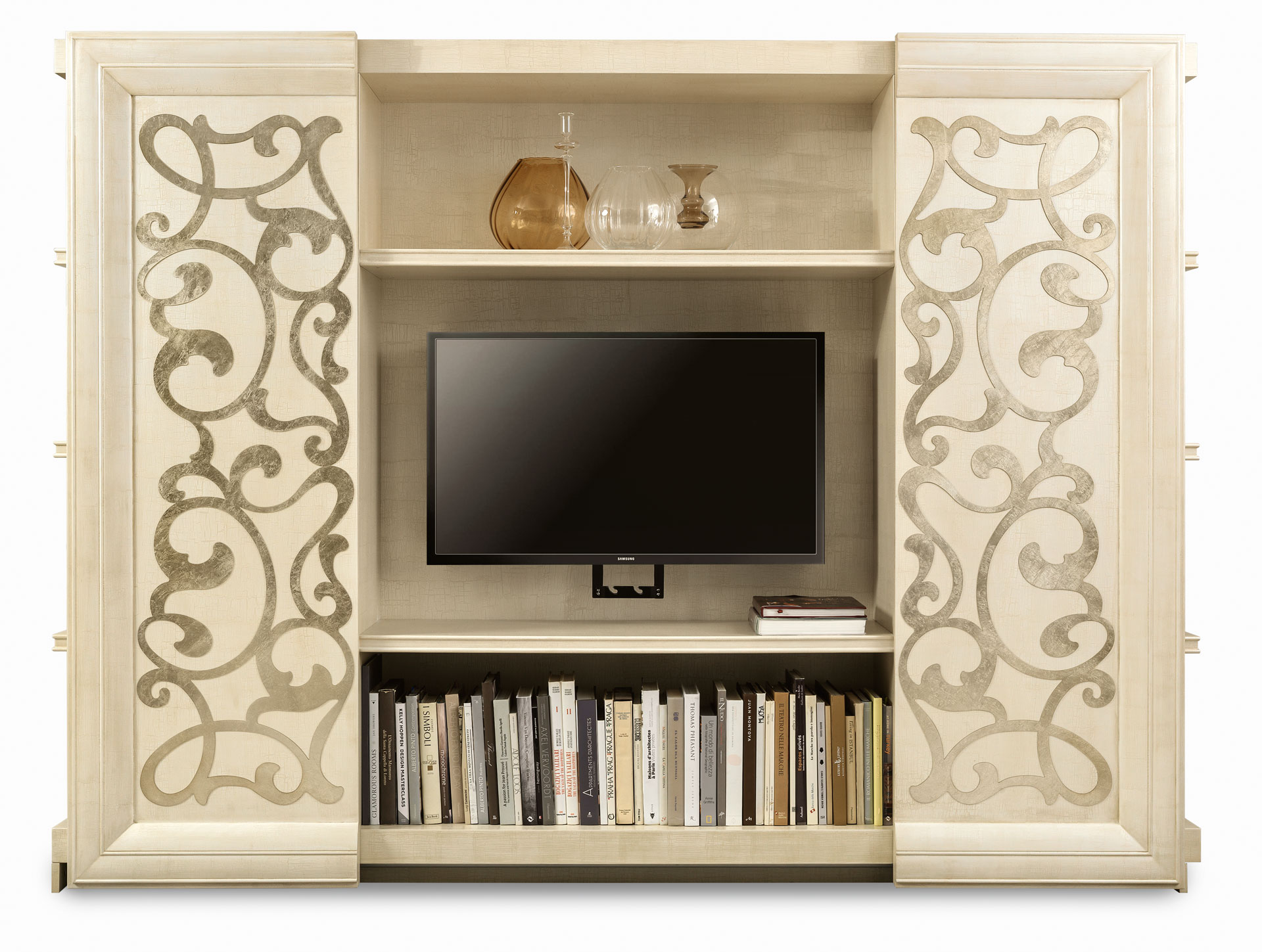 I ripiani esterni e interni sono in legno con profili sagomati. Le ante centrali, decorate artigianalmente, hanno cornici perimetrali in massello sagomato e possono scorrere simultaneamente su binari. L'elemento decorativo è realizzato invece in lamiera di acciaio tagliata a laser e decorata a mano. Possibilità di inserire l’azionamento automatico “touch e telecomando”.