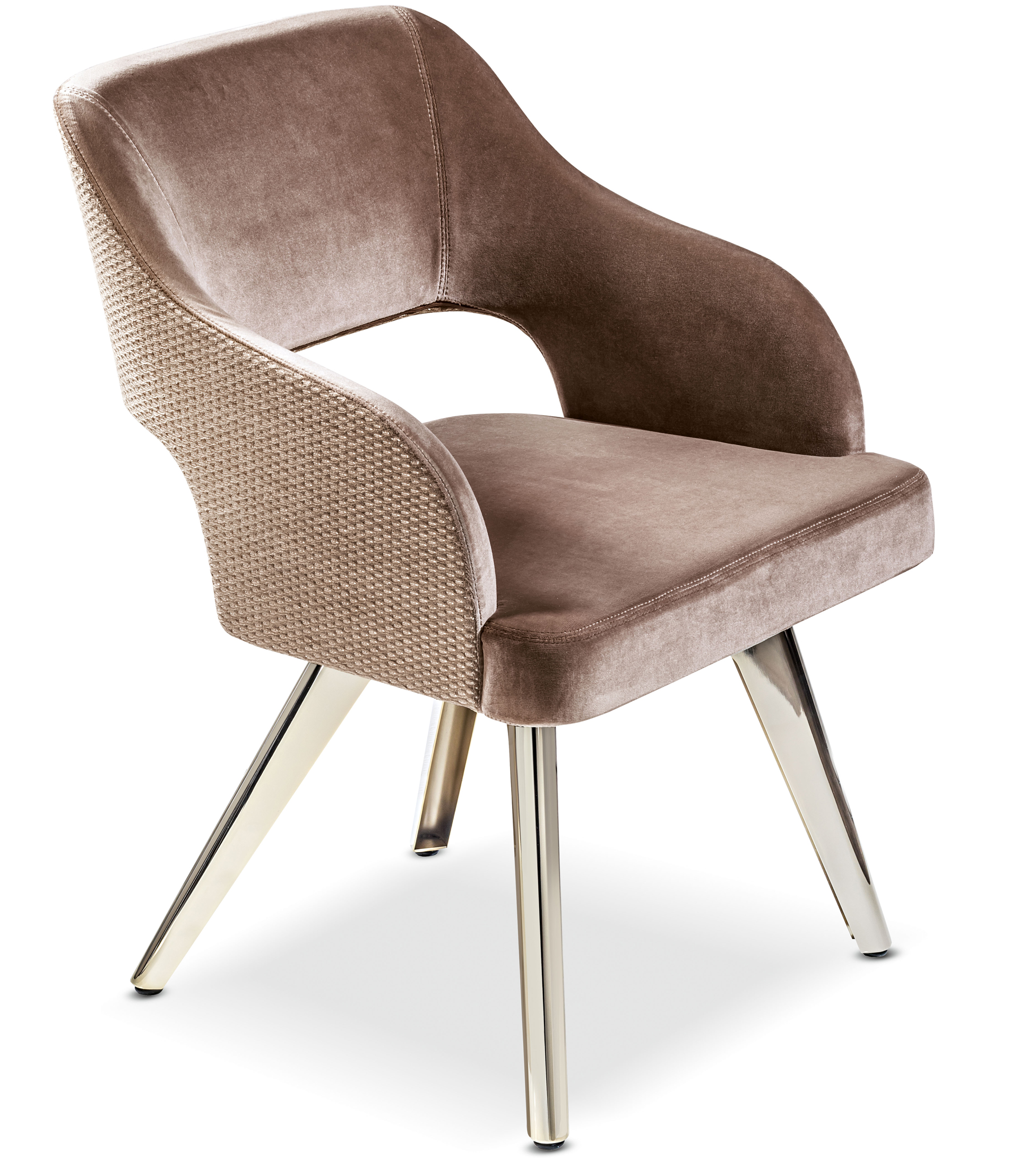 Le gambe sono tagliate a laser e curvate, con finitura in bronzo, oro o ottone. La seduta, sagomata e imbottita, è rivestita con un rivestimento sartoriale in tessuto, velluto, pelle o con un tessuto fornito dal cliente. Design ricercato dal sapore vintage.