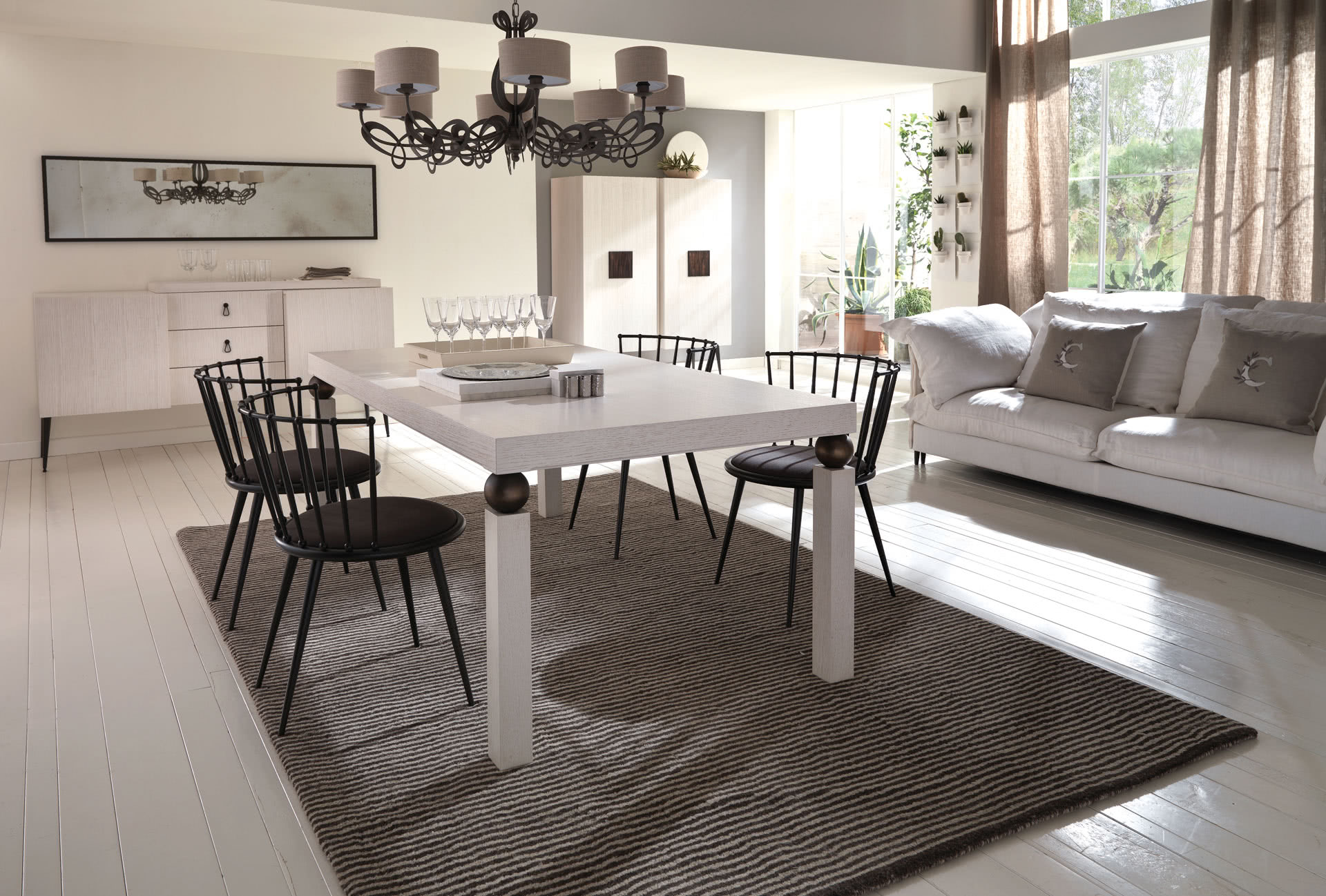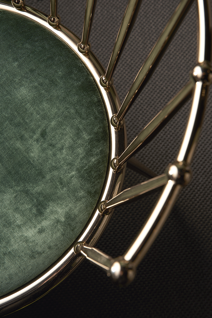 La spalliera è bacchettata, con montaggio a tiraggio interno. La struttura è disponibile in diverse finiture tra le quali in bagno oro, ottone e in ferro metallizzato. La seduta, in legno sagomato e curvato, è imbottita in gomma a due densità e rivestita con una lavorazione sartoriale in tessuto, velluto, pelle o un tessuto fornito dal cliente non sfoderabile. Una sedia dal sapore vintage dal design unico.
