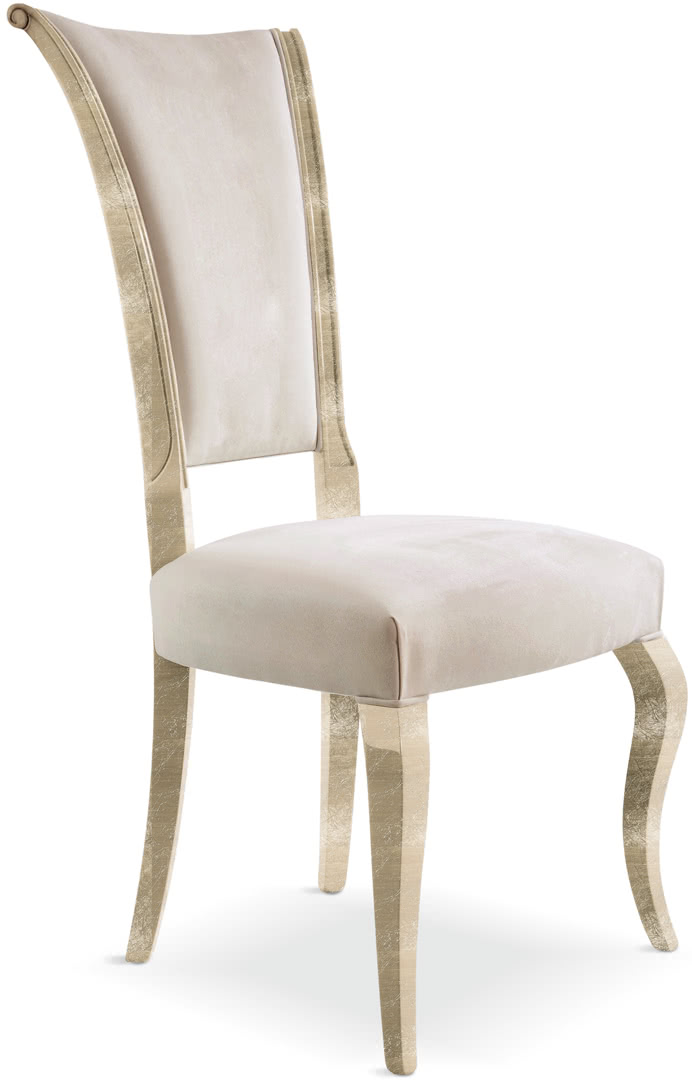 La cornice e le gambe sono in legno massello sagomato e scolpito a mano con finitura in foglia o in madreperla realizzata artigianalmente. La tappezzeria di rivestimento, imbottita, è realizzata a mano in tessuto, velluto, pelle o con un tessuto fornito dal cliente.