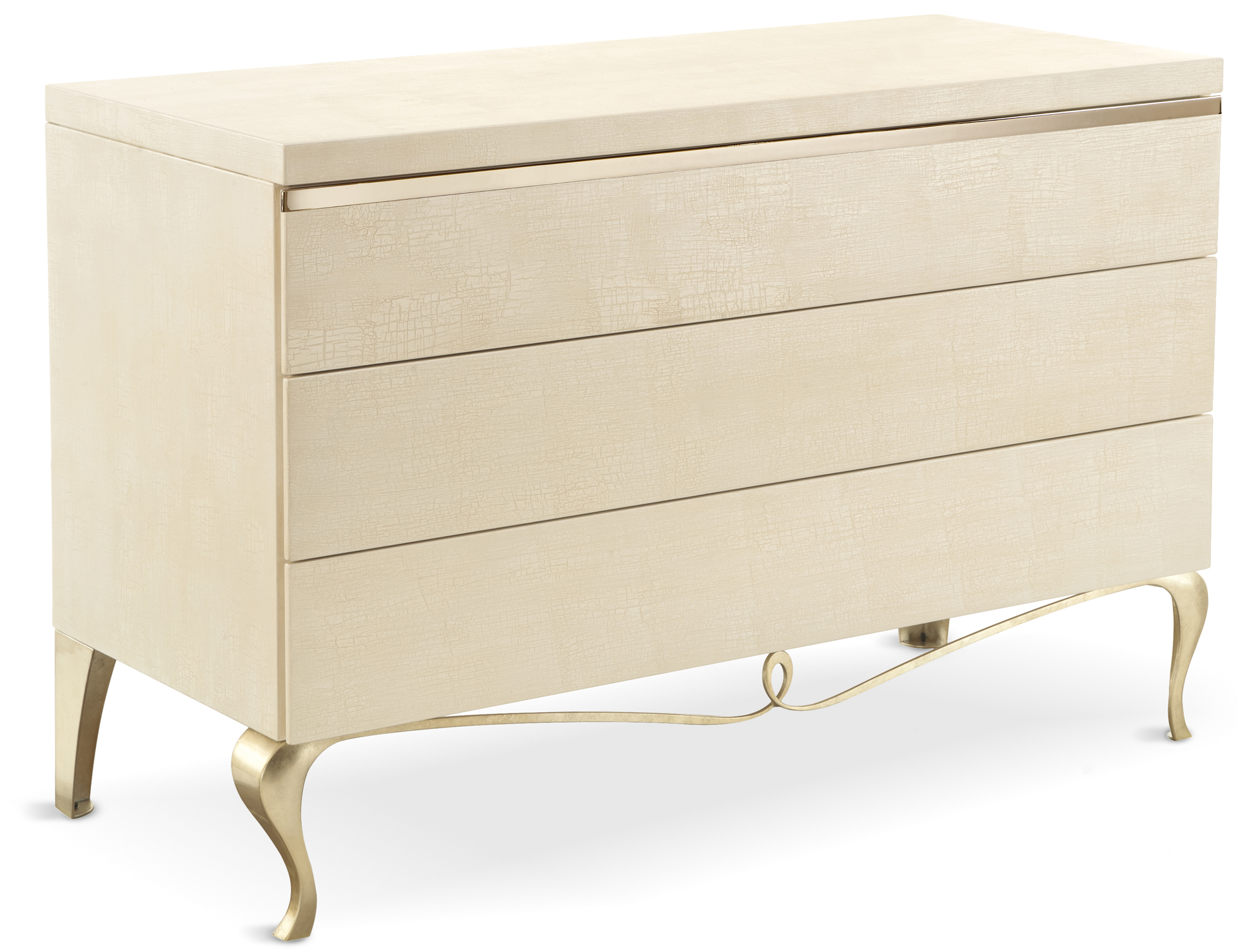 La struttura in legno presenta 3 cassetti con inserto in oro pallido e guide ad estrazione totale e richiamo frenato. I piedi e il telaio sono realizzati in ferro, decorati in foglia argento champagne. Il comò Ghirigori New, insieme ai comodini, crea un gruppo notte elegante e unico.