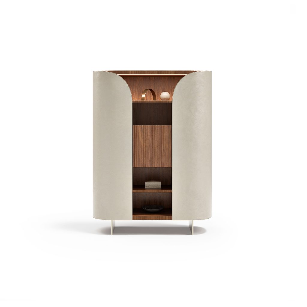 La Collezione Duna incarna l’essenza senza tempo e l’eleganza selvaggia delle maestose dune del deserto. Ispirata alla natura, con le sue forme fluide e la sua grandiosità silenziosa, questa collezione di mobili di lusso trasporta l’atmosfera mozzafiato e la sensazione di libertà trovate nel vasto deserto. Struttura in essenza o laccato. Nr. 2 ante e fianchi disponibili in essenza, laccato o pelle liscia, ripiani interni in vetro bronzato. Parte a giorno composta da Nr. 2 ripiani in essenza o laccato. Nr. 1 contenitore chiuso da 2 ante in essenza o lacatto cannette.