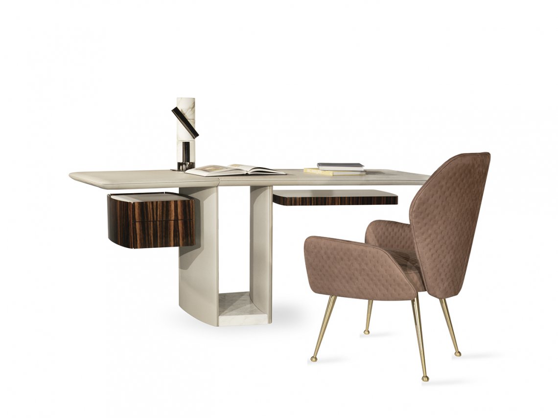 Eclipse writing desk expresses great harmony thanks to its refined lines. The structure presents an unusal design in terms of construction and materials used: two elliptical legs upholstered with leather support an upholstered elegant top while, on the sides of the structure are assembled one shelf on the right and a drawer on the left in ebony wood. Marble table lamp Yale matches really well with this writing desk.