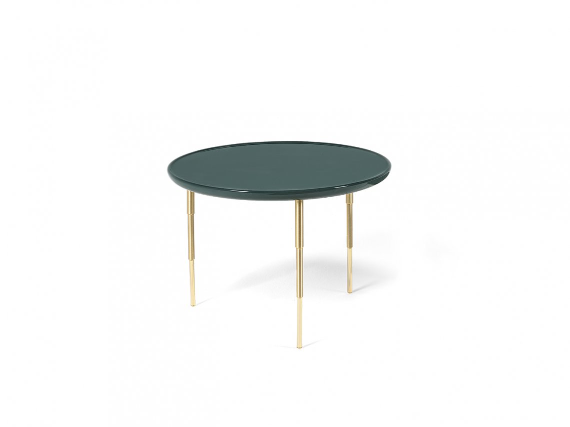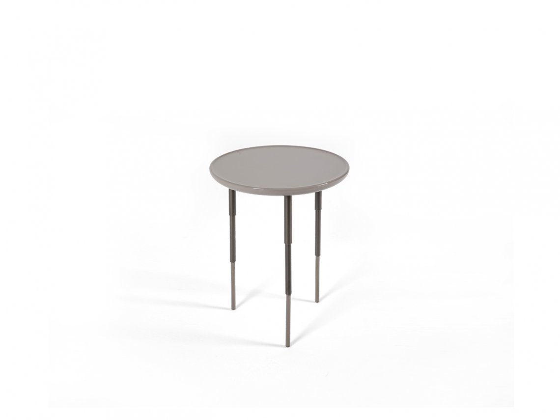 Heron is a “side table” with a light and versatile design. The glossy lacquered top has a rounded edge with a tray shape. The latter is supported by three cylindrical legs that resemble a spyglass in an alternating glossy and brushed finish.
