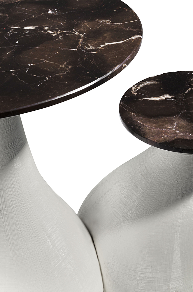 It is a coffee table result of a continuous desire to experience. The base is unusually composed of two vase-shaped bodies different in size and which seem fused together. At the top end there are two circular marble tops with different diameters. The double structure of this coffee table is in ceramic with a three-dimensional finish that can be traced back to the texture of a woven fabric. This piece is particularly suitable for those who are always looking for unique pieces.