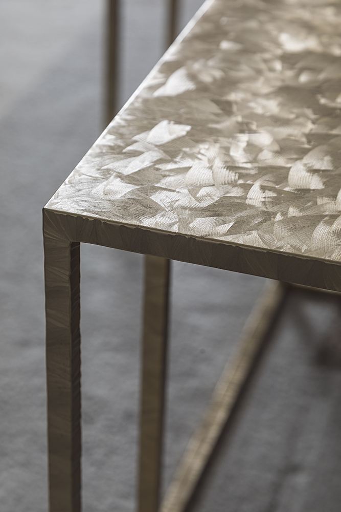 The coffee tables of Lineup collection, available in many sizes, are characterized by a metal structure with linear design. The skillful manual method of metal engraving is inspired by the working techniques of Italian premium class jewelry. Made entirely of a single material, they create extraordinary and unique reflections of light. These coffee tables are often used in combination with other pieces of the same collection with marble top or with a decorative resin-based finish top.