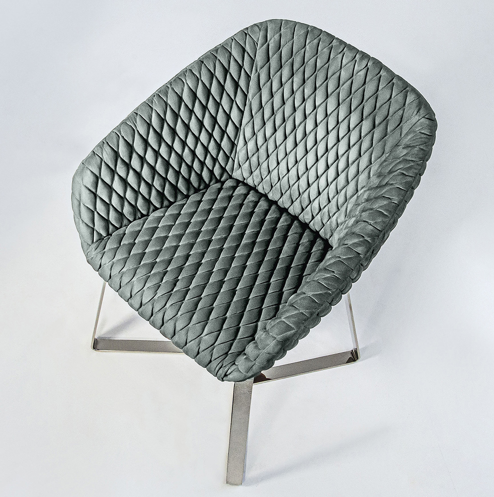 The armchair Oliver is a piece that recalls the style of the 50s. The whole seat is wrapped in a diamond-shaped quilting that gives the surface a three-dimensional light-and-dark effect. The structure supporting the seat is made up of two metal ribbons which, embellished by hand-made sculptural work, create a pleasant geometric effect. This armchair is customizable with upholstery in leather or fabric as well as in the chromatic metal finishes.