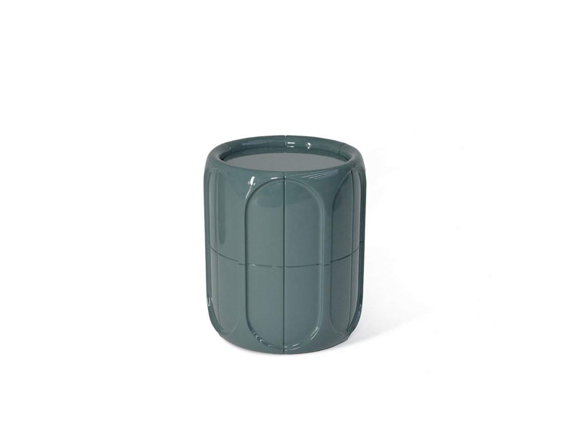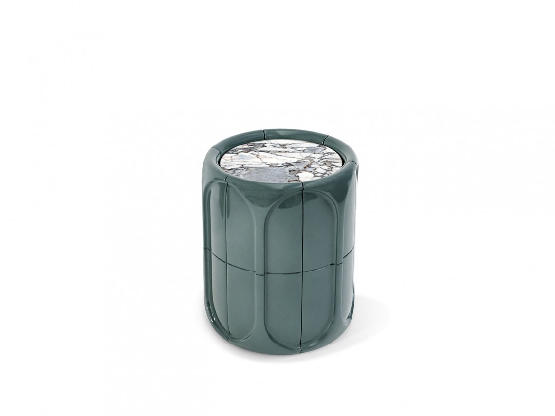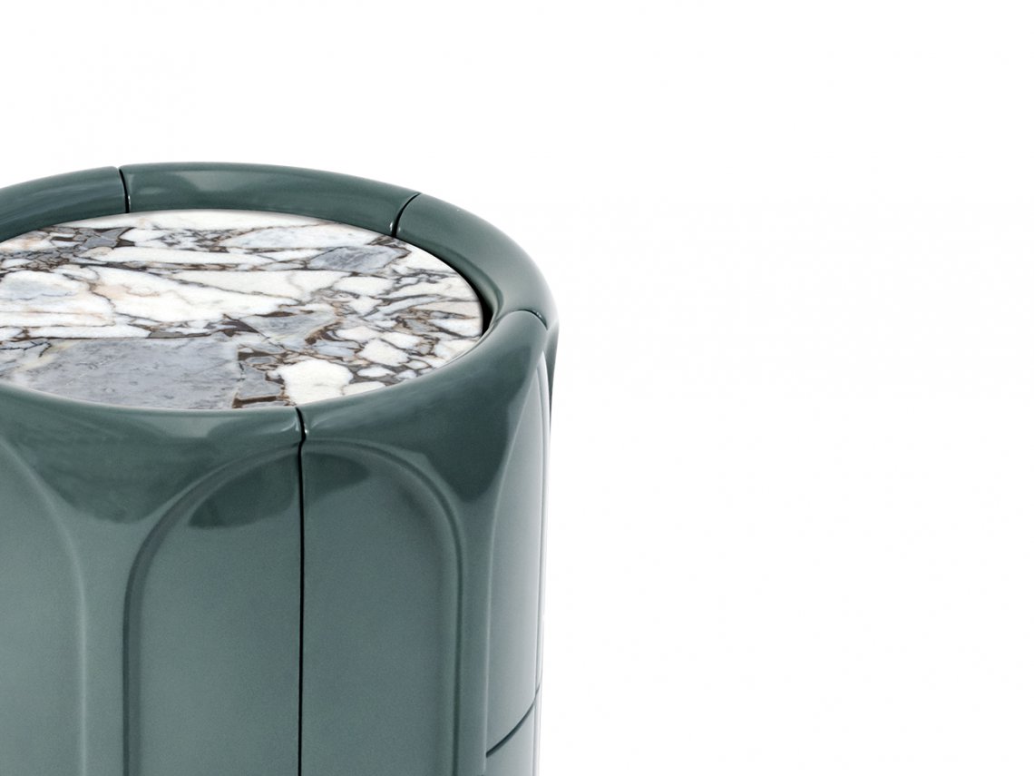 Concave coffee table enriches the living area with a sculptural touch and is characterized by a round shape embellished on the surface by many three-dimensional facets, inspired by the columns of the Roman era. It is available in various colours with a glossy or matt finish.