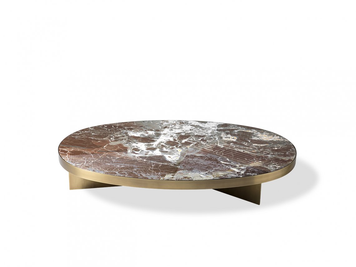 This coffee table Linfa is characterized by a precious marble top with parallel engravings that create geometrical patterns on the surface: the metal parts, available in different finishes, both envelope the marble and support the top. It’s also available a smaller side table to be matched with this one.