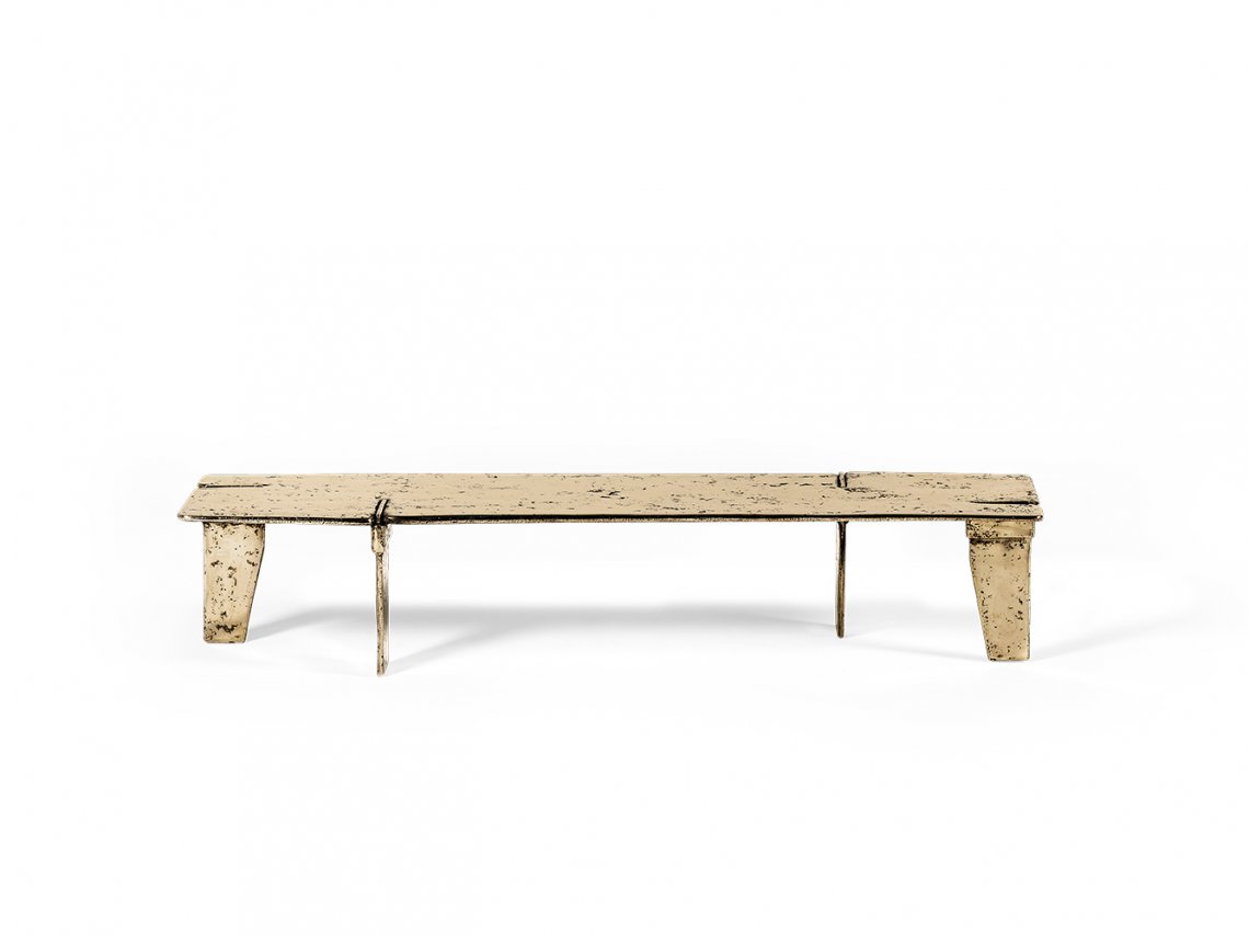 The metal version of the coffee table Overlap is realized by casting bronze into special molds made of sand. The sculptural look of the surface and the use of bronze metal as raw material makes this item a contemporary artwork.