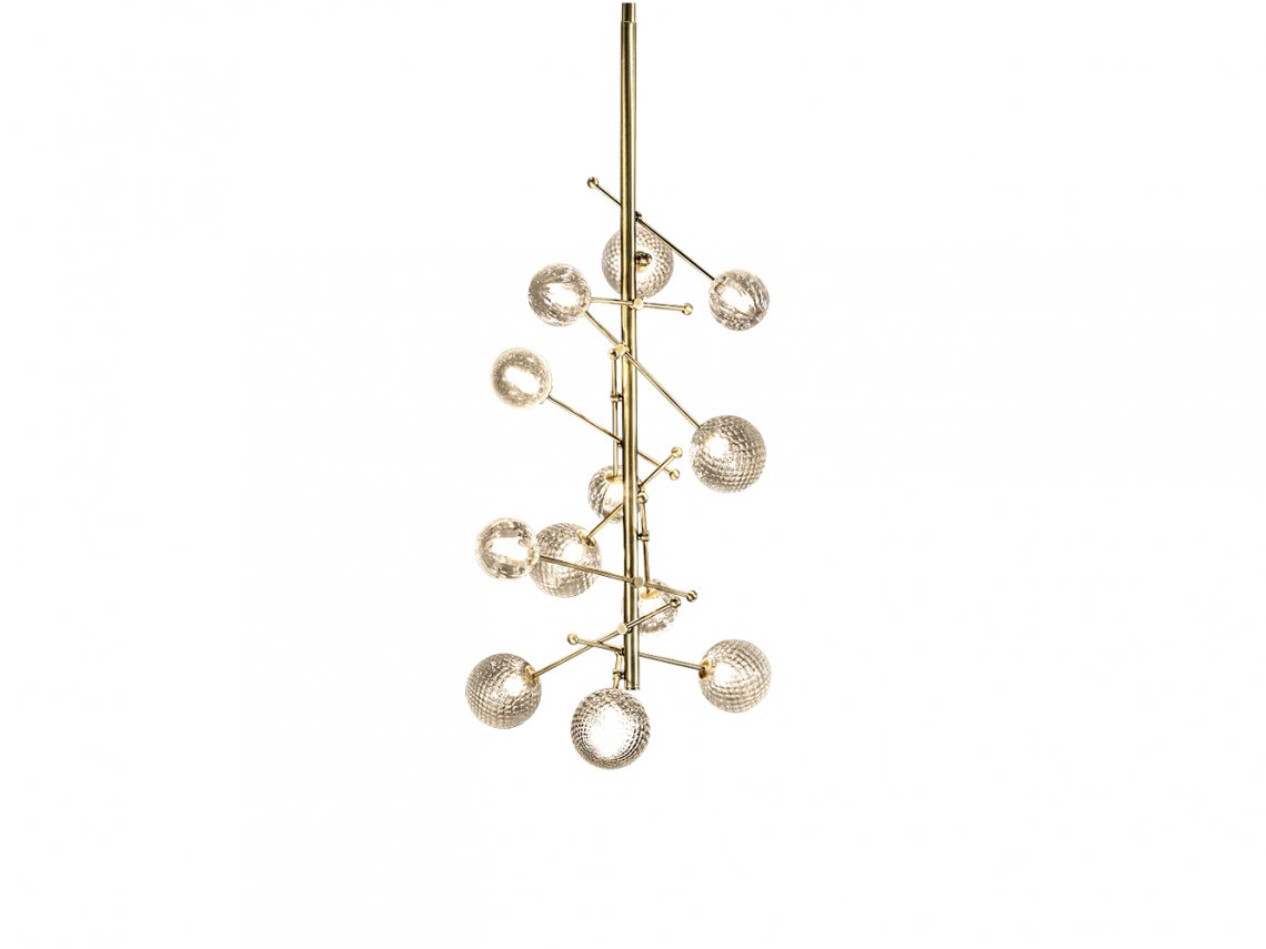 Planetarium chandelier is characterized by a vertical pipe that ramifies towards the floor into different metal branches with adjustable inclination that support glass-blown spheres realized by glass-masters of Venice area. These spheres, which the light spreads through, have different dimensions and are realized following different tecniques like “Balloton” with three-dimensional crossed pattern or “pulegoso” that presents small bubbles inside of the glass. This chandelier is suitable to be hung on a wall and it’s recommended for a reading room.
